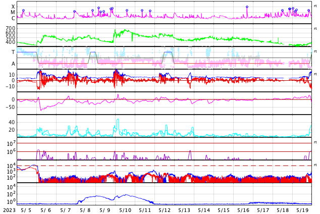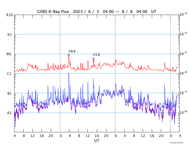 GOES衛星の太陽X線強度。赤・橙 = 0.1〜0.8 nm、青・紫 = 0.05〜0.4 nm (c) データ:NOAA/SWPC、作図:宇宙天気ニュース ![]() | ||||||||||||||||||||||||||||||||||||||||||||||||||||||||||||||||||||||||||||||||||||||||||||||||||||||||||||||||||||||||||||||||||||||||||||||||||||||||||||||||||||||||||||||||||||||||||||||||||||||||||||||||||||||||||||||||||||||||||||||||||||||||||||||||||||||||||||||||||||||