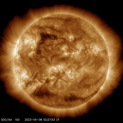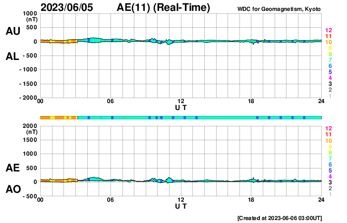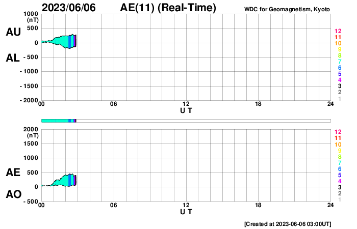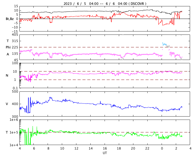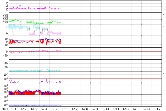 2023/ 6/ 6 12:10 更新 太陽風は低速で、磁気圏も穏やかです。太陽も穏やかな状態です。 担当 篠原 太陽風は、昨日のニュースの後に速度が400km/秒に上がりましたが、 今日未明から再び下がって、 現在は350km/秒と低速の状態に戻っています。 磁場強度は、8nT前後と少し強まった状態で推移しています。 磁場の南北成分は、北寄りの傾向になっています。 磁気圏は穏やかで、AE指数は変化のない状態が続いています。 AE指数のグラフの最後に小規模の高まりが発生していますが、 これは、太陽風磁場がグラフの最後で 一時的に南向きに変化したことに関係しています。 その後、磁場は北向きに変わっているので、 AE指数もこの後は再び穏やかになるでしょう。 太陽は、X線グラフの変化が少なくなり、 穏やかな状態になっています。 昨日注目した3327黒点群も、 以降はC1〜2の小規模フレアを起こした程度です。