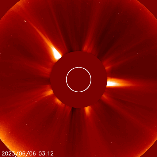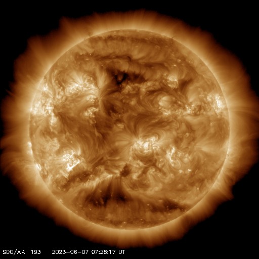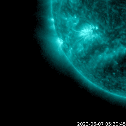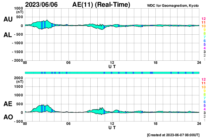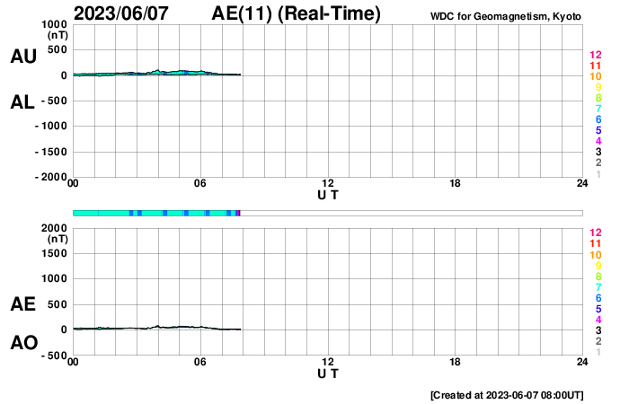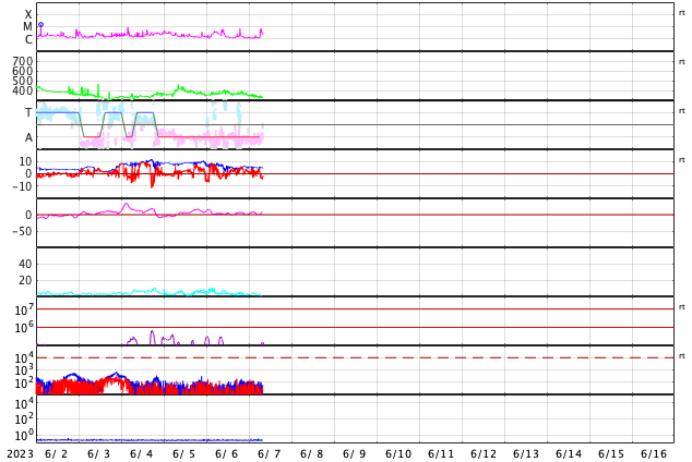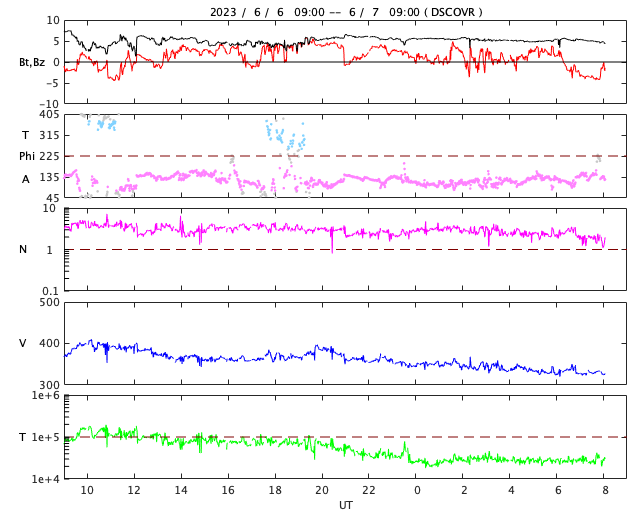 2023/ 6/ 7 17:19 更新 太陽風は低速で、磁気圏は穏やかです。C7.1の小規模フレアが発生しています。 担当 篠原 太陽風は、350km/秒前後の低速の状態が続いています。 磁場強度は5nTと平均的な状態です。 磁場の南北成分は、北寄りの傾向が続いています。 磁気圏は静穏で、AE指数はほとんど変化のない状態です。 SDO衛星AIA193の太陽コロナ写真では、 中心部の北側、南側それぞれに コロナホールの薄暗い領域が見えています。 3日後くらいから太陽風に影響が見られるかもしれません。 太陽では、昨日の昼、6日13時(世界時6日4時)頃に 東端(左端)の向こう側で フィラメント噴出などの現象が発生した様で、 SOHO衛星LASCO C2、C3で きれいなCME(コロナ質量放出)の広がりが観測されています。 横向きなので地球への影響はありません。 また、南東の3327黒点群の少し南側で、 7日15時半(世界時7日6時半)に、 C7.1の小規模フレアが発生しました。 GOES衛星SUVI 131と304の動画を掲載します。 フレアとともにフィラメント噴出が発生して、 コロナが左下に飛び出しています。 この後、CMEが観測されそうです。