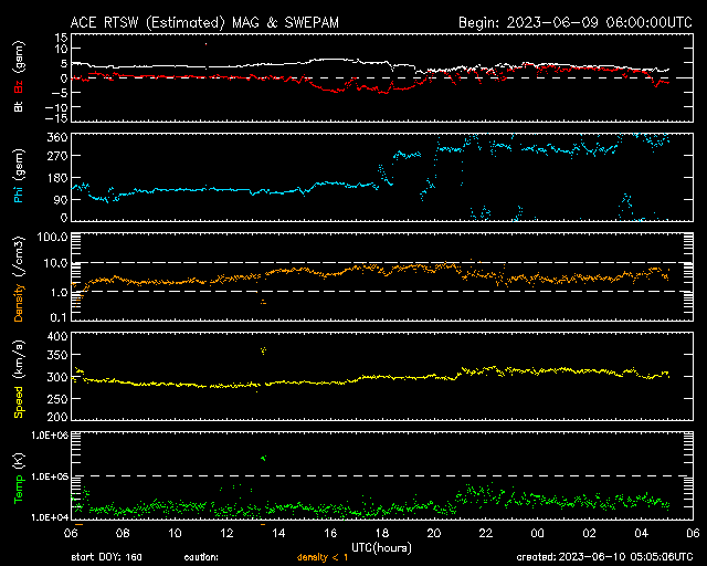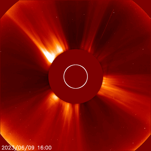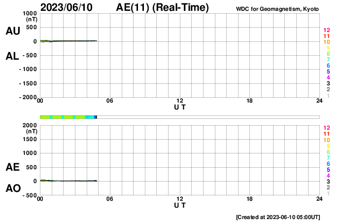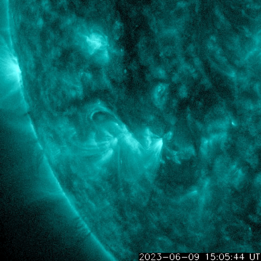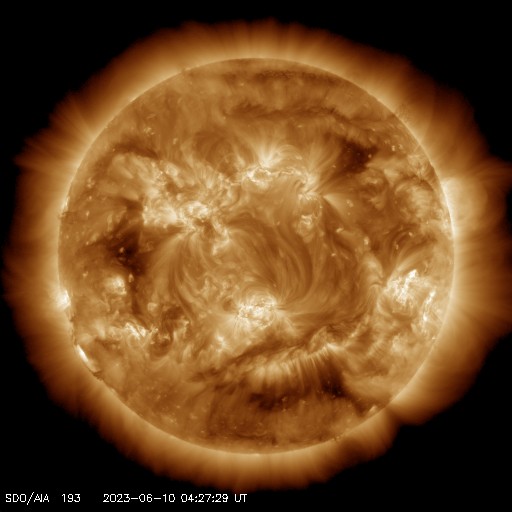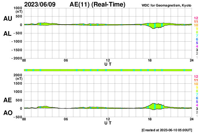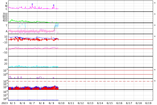 2023/ 6/10 14:06 更新 太陽風はかなり低速になりました。M2.5の中規模フレアが発生しました。 担当 篠原 太陽風の速度は、 昨日のニュース以降280km/秒へ下がり、 かなり低速になりました。 今日未明からは300km/秒へ戻っていますが、 低速の状態は続いています。 磁場強度は、3〜5nTとやや弱くなっています。 磁気圏は静穏で、 AE指数は小規模の変化が1回起きている程度です。 SDO衛星AIA193では、 コロナホールが北西(右上)と南西(右下)へ進んでいます。 これから影響がやって来るでしょうか。 また、東側(左側)の赤道付近にコロナホールが見えています。 次の注目はこの領域になりそうです。 太陽では、今日未明、10日5時(世界時9日17時)に、 南東側(左下)の3331黒点群で、 M2.5の中規模フレアが発生しています。 SDO衛星AIA131の動画を掲載します。 このフレアに伴って、 太陽の左下に広がるCME(コロナ質量放出)が発生しています。 地球に対して斜め方向の噴出なので、 3日後くらいに太陽風の小規模の乱れがやって来るかもしれません。