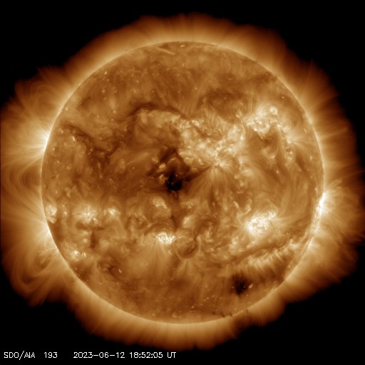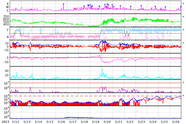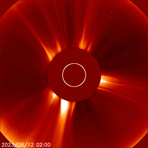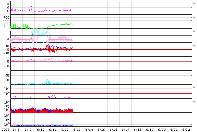 2023/ 6/13 12:49 更新 太陽風の速度は少し高めです。磁気圏は穏やかです。 担当 篠原 昨日紹介したフィラメント噴出による CME(コロナ質量放出)の様子を、 SOHO衛星LASCO C2、C3の動画で紹介します。 太陽の上に向かってガスが飛び出しています。 地球への影響はないでしょう。 太陽では、北西(右上)の3330黒点群でC5.2、 南西(右下)の3327群でC5.1など、 Cクラスの小規模フレアが度々発生しています。 しかし、あまり活動的な印象はありません。 東端(左端)の向こう側の南北に、活動的な領域がある様です。 どの様な領域が現れるでしょうか。 太陽風は、昨日のニュース以降も 速度は450km/秒の状態が続いています。 磁場強度は、7nT前後で推移しています。 変化としては小幅ですが、 27日周期の図を見ると、11日以降、 太陽風が少し強まった状態になっている様です。 磁気圏は穏やかで、 AE指数はほとんど変化のない状態です。 SDO衛星AIA193では、 中心部に小ぶりのコロナホールが見えています。 広がりが小さいので影響も小さくなりそうですが、 3日後くらいの太陽風に強まりが見られるかもしれません。 ![]() 太陽の北側のフィラメント噴出によるCMEの様子。 (c) SOHO衛星LASCO C2、C3 (ESA & NASA)、(動画加工 : 宇宙天気ニュース) ![]() SDO衛星のAIA193カメラによる太陽コロナの様子 (c) SDO (NASA) ![]() SDO衛星による太陽の可視光写真。マウスの矢印を写真に重ねると、黒点番号付きの写真に切り替わります。 (c) SDO (NASA) ![]() GOES衛星の太陽X線強度。赤・橙 = 0.1〜0.8 nm、青・紫 = 0.05〜0.4 nm (c) データ:NOAA/SWPC、作図:宇宙天気ニュース ![]() DSCOVRが観測した太陽風の磁場(黒線は全体の強度、赤線は南北成分) 磁場の向き、プラズマの密度、速度、温度 (c) データ:NOAA/SWPC、作図:宇宙天気ニュース ![]() AE指数(速報値) 下段のAEグラフの値が高くなると、オーロラ活動が活発化しています。 (c) 京都大学WDC ![]() ![]() 27日の太陽周期に合わせた図 太陽が同じ面を地球に向けていた27日前の変化から、今後を予想することができます。 (c) 作図:宇宙天気ニュース