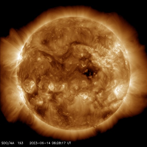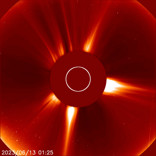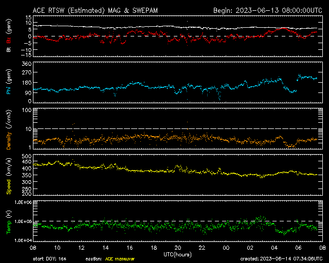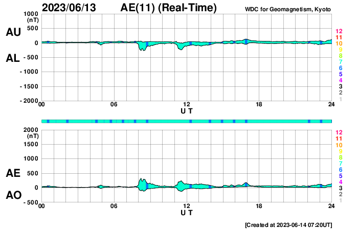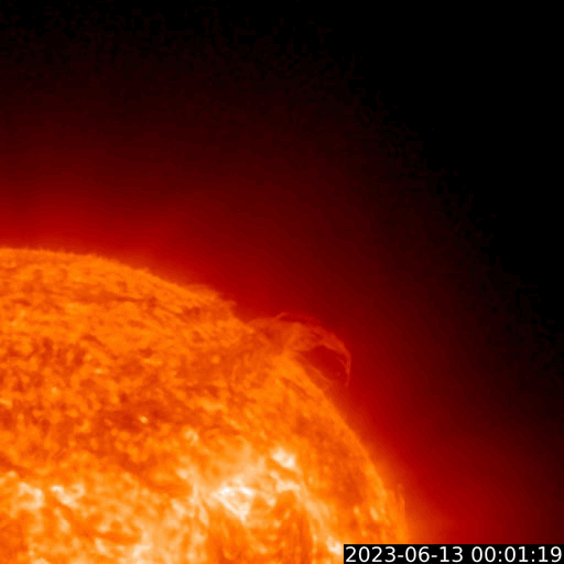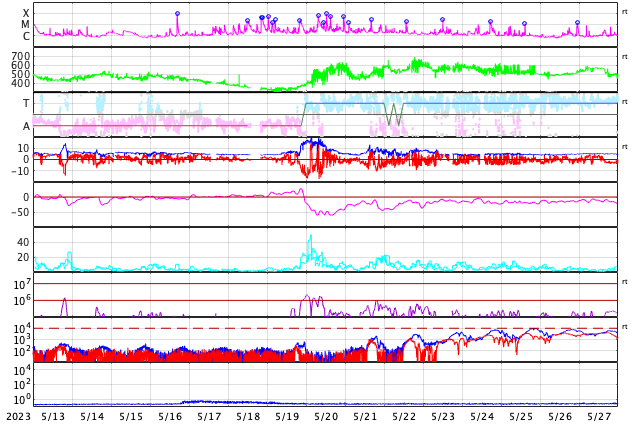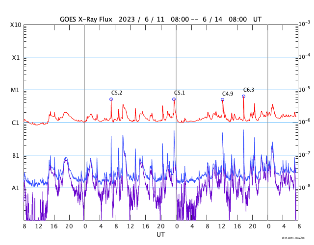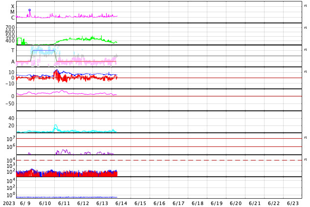 2023/ 6/14 16:36 更新 プロミネンス噴出が発生しています。太陽風は低速になっています。 担当 篠原 昨日、13日10時(世界所13日1時)頃に、 太陽の北の端近くでプロミネンス噴出が発生しています。 GOES衛星SUVI 304の動画を掲載します。 これにより、SOHO衛星LASCO C2、C3では、 太陽の上に向かって飛び出すCME(コロナ質量放出)が 観測されています。 地球に対して横向きの噴出なので、影響はありません。 昨日、一昨日のニュースで紹介した現象と似ていますすが、 別の現象です。 活発な太陽の活動が続いています。 フレアは、太陽の北東に現れた3334黒点群でC6.3、 南東の3333群でC3.7などの小規模フレアが発生しています。 東側の領域は、この後どの様な活動を起こすでしょうか。 太陽風は、速度が430km/秒から350km/秒へ下がり、 低速になっています。 磁場強度は、7nTから5nTへ少し下がっていますが、 こちらは平均的な状態です。 磁気圏は概ね静穏で、 AE指数は小規模の変化が時々発生している程度です。 ![]() 太陽の北側で発生したプロミネンス噴出。 (c) GOES衛星SUVI 304 (NOAA)、(動画加工 : 宇宙天気ニュース) ![]() 太陽の上に向かって広がるCME。 (c) SOHO衛星LASCO C2、C3 (ESA & NASA)、(動画加工 : 宇宙天気ニュース) ![]() SDO衛星のAIA193カメラによる太陽コロナの様子 (c) SDO (NASA) ![]() SDO衛星による太陽の可視光写真。マウスの矢印を写真に重ねると、黒点番号付きの写真に切り替わります。 (c) SDO (NASA) ![]() GOES衛星の太陽X線強度。赤・橙 = 0.1〜0.8 nm、青・紫 = 0.05〜0.4 nm (c) データ:NOAA/SWPC、作図:宇宙天気ニュース ![]() ACEが観測した太陽風の磁場(1番上の枠、白線は全体の強度、赤線は南北成分) および、太陽風の密度(3番目の橙線)、速度(4番目の黄線) (c) NOAA/SWPC ![]() AE指数(速報値) 下段のAEグラフの値が高くなると、オーロラ活動が活発化しています。 (c) 京都大学WDC ![]() ![]() 27日の太陽周期に合わせた図 太陽が同じ面を地球に向けていた27日前の変化から、今後を予想することができます。 (c) 作図:宇宙天気ニュース