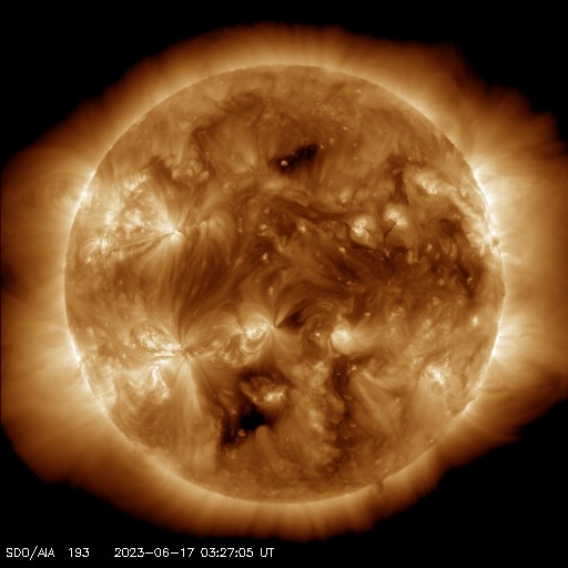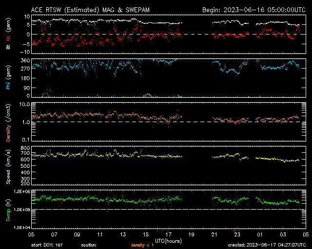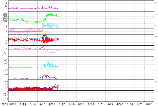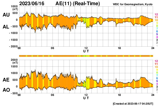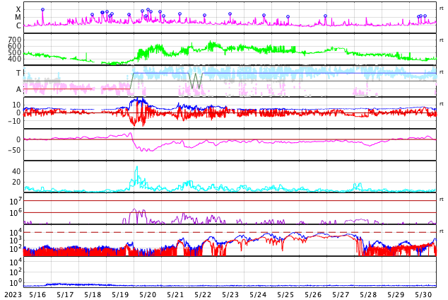 2023/ 6/17 13:28 更新 高速の太陽風が続いていますが、速度は少し下がっています。 担当 篠原 太陽風の速度は、 今朝まで650km/秒に高まった状態が続きましたが、 グラフの最後で少し下がり、現在は570km/秒です。 高速の状態は続いています。 磁場強度も、小幅ですが7nTから5nTへ下がり、 平均的な値に戻っています。 磁場の南北成分は、グラフの前半は南寄りでしたが、 後半は0nT付近で小さく変化する様になっています。 このため、AE指数のグラフも 初めは1000nTくらいの大きい変化が続いていますが、 途中から変化が一段小さくなっています。 SDO衛星AIA193では、 中心部の南北にコロナホールが見えています。 3〜4日後くらいからこの領域の影響が到来する可能性があります。 太陽は、北東(左上)の3337、3338黒点群と、 南西(右下)の331群で、 それぞれM1.0の中規模フレアが発生しています。 X線グラフが少しにぎやかになっています。