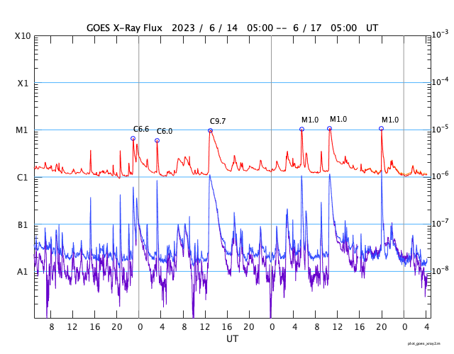 GOES衛星の太陽X線強度。赤・橙 = 0.1〜0.8 nm、青・紫 = 0.05〜0.4 nm (c) データ:NOAA/SWPC、作図:宇宙天気ニュース ![]() | |||||||||||||||||||||||||||||||||||||||||||||||||||||||||||||||||||||||||||||||||||||||||||||||||||||||||||||||||||||||||||||||||||||||||||||||||||||||||||||||||||||||||||||||||||||||||||||||||||||||||||||||||||||||||||||||||||||||||||||||||||||||||||||||||||||||||