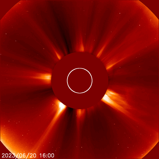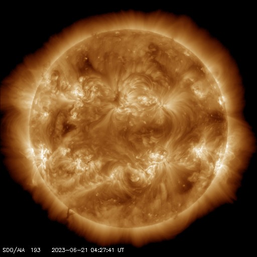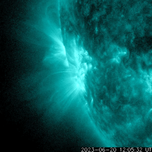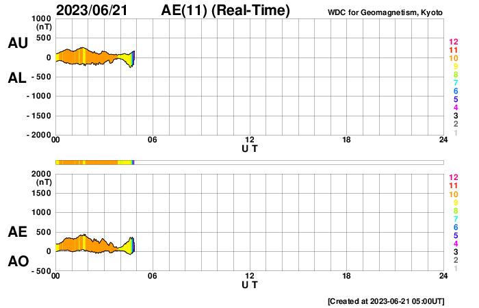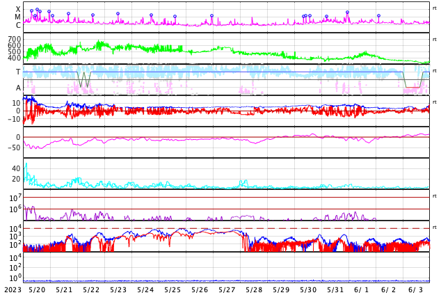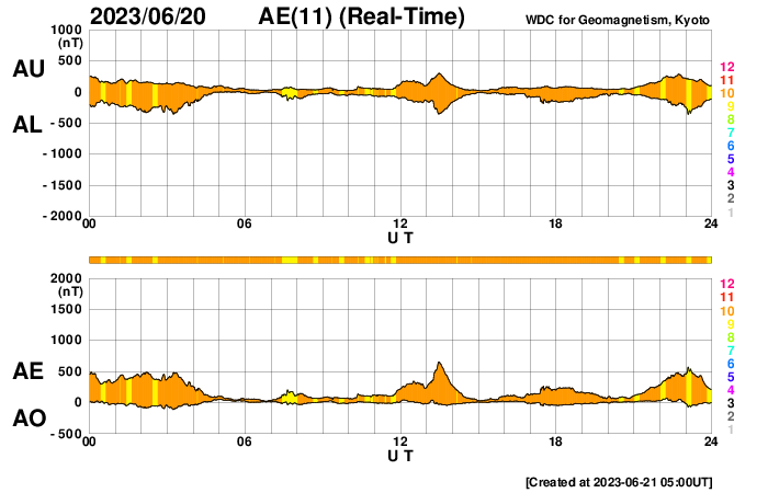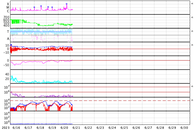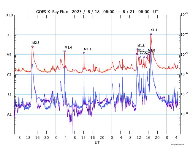 2023/ 6/21 14:08 更新 X1.1の大規模フレアが発生しました。太陽風は平均的な状態です。 担当 篠原 21日1時半(世界時20日16時半)に、 太陽の南東の端近く(左下)の3341黒点群で、 X1.1の大規模フレアが発生しました。 SDO衛星AIA131の動画を掲載します。 Xクラスに達するフレアの発生は、 3月29日のX1.2以来で、およそ3か月ぶりです。 SOHO衛星LASCO C2、C3では、 太陽の左側に飛び出すCME(コロナ質量放出)が観測されています。 地球に対して横向きの噴出なので、影響はないでしょう。 X線グラフを見ると、 X1.1の前に、M1.0、M1.8、M1.0と 中規模フレアが3回発生しています。 これらは、南西の端(右下)の3342群で発生しています。 この領域はこの後見えなくなります。 3341群の活動は、この後も続くでしょうか。 太陽風は、速度が400〜450km/秒の間で変化していて、 平均的な状態が続いています。 磁場強度は、8nTから6nTへゆっくり下がって、 平均的な値になっています。 磁場の南北成分は、 グラフの後半で南向きの変化が見られる様になっています。 AE指数は、500nT程度の変化が時間をおいて発生していて、 磁気圏はある程度活動的です。 SDO衛星AIA193の太陽コロナ写真は、 中心部はぼんやりと光っていて、 コロナホールは特に見えていません。 この後、太陽風は穏やかな状態が続きそうです。