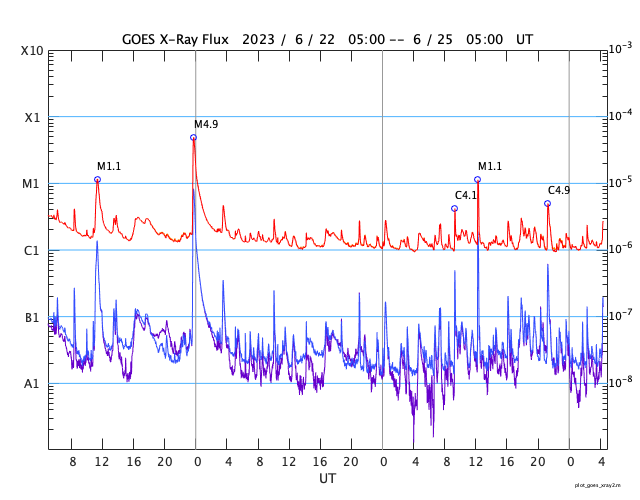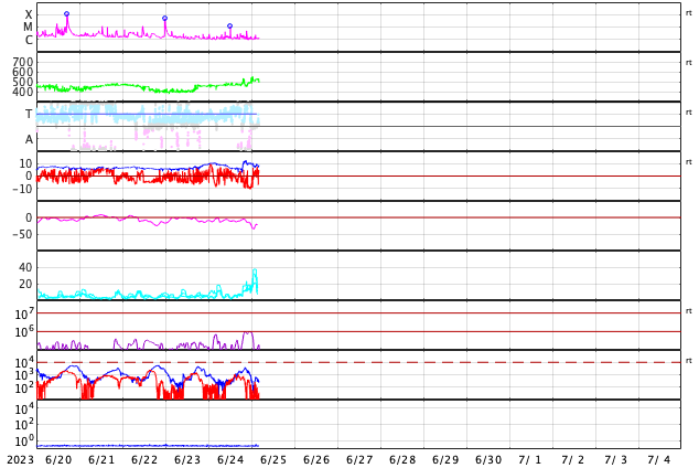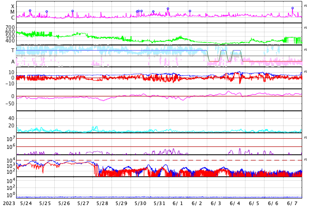 GOES衛星の太陽X線強度。赤・橙 = 0.1〜0.8 nm、青・紫 = 0.05〜0.4 nm (c) データ:NOAA/SWPC、作図:宇宙天気ニュース ![]() | ||||||||||||||||||||||||||||||||||||||||||||||||||||||||||||||||||||||||||||||||||||||||||||||||||||||||||||||||||||||||||||||||||||||||||||||||||||||||||||||||||||||||||||||||||||||||||||||||||||||||||||||||||||||||||||||||||||||||||||||||||||||||||||||||||||||||||||||||||||||||||||||||||