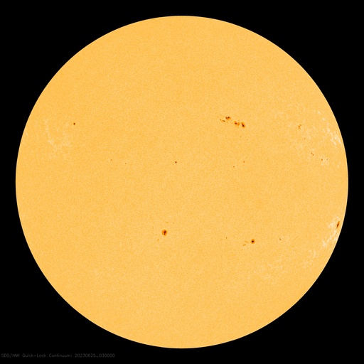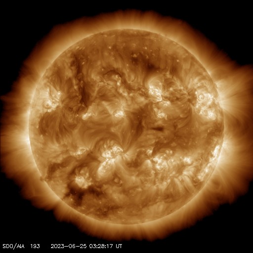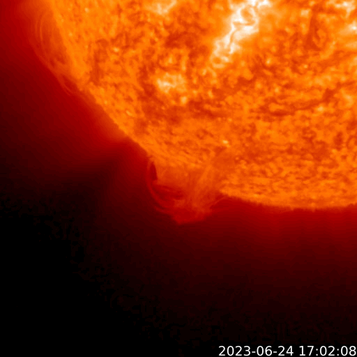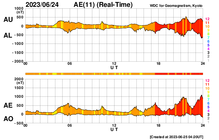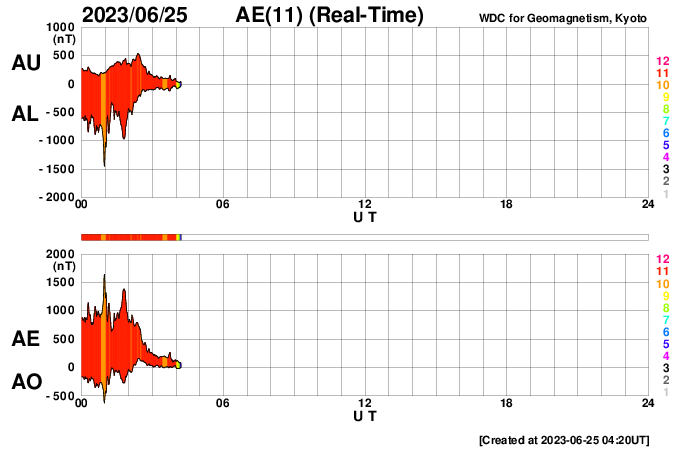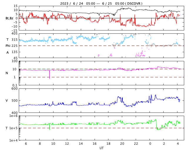 2023/ 6/25 13:31 更新 太陽風は高速になっています。磁気圏活動が一時的に強まりました。 担当 篠原 太陽風の速度は450km/秒付近で推移していましたが、 今朝早くに一段高まって、 現在は520km/秒と高速の状態になっています。 磁場強度は、5〜10nTの間をゆっくり変化しています。 磁場の南北成分は、 北向いたり、南を向いたり、ゆっくり変化していましたが、 グラフの後半で、-10nTの南向きの強まりが 4時間ほど発生しています。 この影響で、AE指数は1000nTに達する大きい変化が しばらく発生しています。 現在は磁場の南向きの強まりは終わっているので、 磁気圏も穏やかになっています。 太陽風速度の高まりは、この後どの様に推移するでしょうか。 27日周期の図を見ると、 前周期の太陽風は、速度はゆっくりと下がっています。 太陽は、北西(右上)の3337黒点群でM1.1の中規模フレア 南西(右下)の3335群でC4.9の小規模フレアが発生し、 その他の領域でもC1〜3の小規模フレアが発生しています。 可視光写真では、あちこちに黒点群が見えています。 現在は3340群の活動が目立っている印象です。 引き続き注目して下さい。 また、今日未明から今朝にかけて、 GOES衛星SUVI 304で、 太陽の南東の端(左下)でプロミネンスが きれいに噴き上がる様子が見えていました。 動画を掲載します。