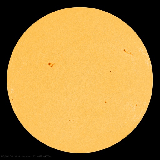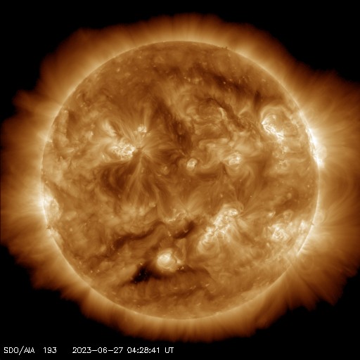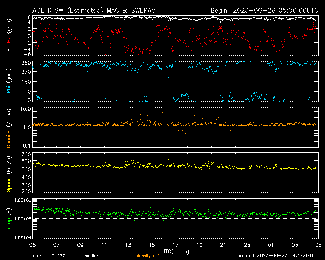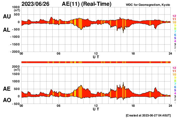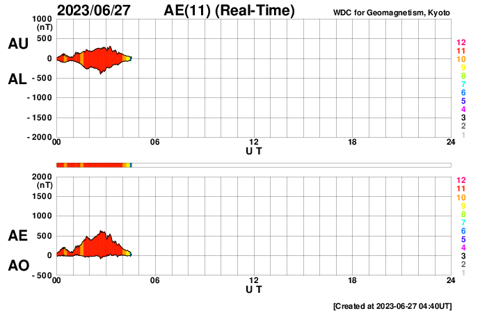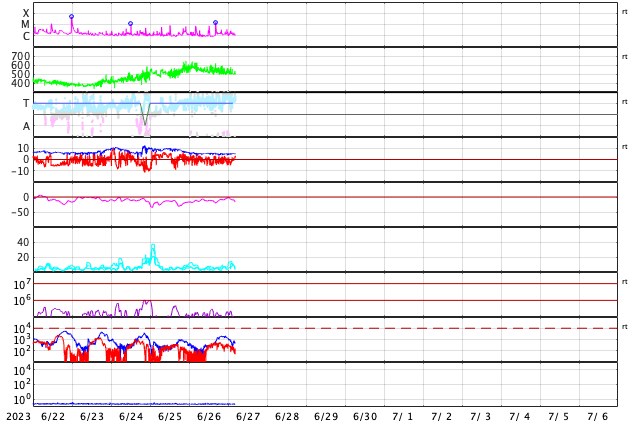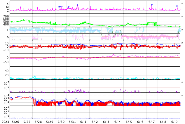 2023/ 6/27 13:47 更新 高速の太陽風が続いています。磁場が南寄りで、磁気圏もやや活動的です。 担当 篠原 太陽風の速度は、500km/秒と高速の状態で推移しています。 磁場強度は5nTと平均的な状態です。 磁場の南北成分は、変化は小幅ですが、 南寄りの傾向になっています。 速度が高まっていることもあり、磁気圏はやや活動的になっていて、 AE指数は、500nTを少し超えるくらいの中規模の変化が 繰り返し発生しています。 太陽は、北西(右上)の3340黒点群の活動が目立っていて、 深夜、27日1時(世界時26日16時)にM1.6の中規模フレアと、 その前後に、C7.6、C3.4などの小規模フレアを起こしています。 また、可視光写真では、中心部北東側(左上)で 3354黒点群の発達が目立っています。 昨日からの変化を、SDO衛星の可視写真の動画で紹介します。 この後、フレアを起こすような領域になるでしょうか。 GOES衛星SUVI 304を見ると、 太陽の左上端と左端でプロミネンス噴出が発生しています。 STEREO Ahead衛星COR2では、 この噴出によるのではないかと思われるCME(コロナ質量放出)が 2つ連続して観測されています。 地球に対して横向きの噴出なので、影響はなさそうです。