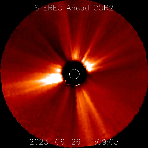 (c) SDO衛星HMII、(動画加工 : 宇宙天気ニュース) ![]() 太陽の左上や左端でプロミネンス噴出が発生しています。 (c) GOES衛星SUVI 304 (NOAA)、(動画加工 : 宇宙天気ニュース) ![]() CMEも2方向に飛び出しています。 (c) STEREO Ahead衛星COR2 (NASA)、(動画加工 : 宇宙天気ニュース) ![]() SDO衛星のAIA193カメラによる太陽コロナの様子 (c) SDO (NASA) ![]() SDO衛星による太陽の可視光写真。マウスの矢印を写真に重ねると、黒点番号付きの写真に切り替わります。 (c) SDO (NASA) ![]() ACEが観測した太陽風の磁場(1番上の枠、白線は全体の強度、赤線は南北成分) および、太陽風の密度(3番目の橙線)、速度(4番目の黄線) (c) NOAA/SWPC ![]() AE指数(速報値) 下段のAEグラフの値が高くなると、オーロラ活動が活発化しています。 (c) 京都大学WDC ![]() ![]() 27日の太陽周期に合わせた図 太陽が同じ面を地球に向けていた27日前の変化から、今後を予想することができます。 (c) 作図:宇宙天気ニュース