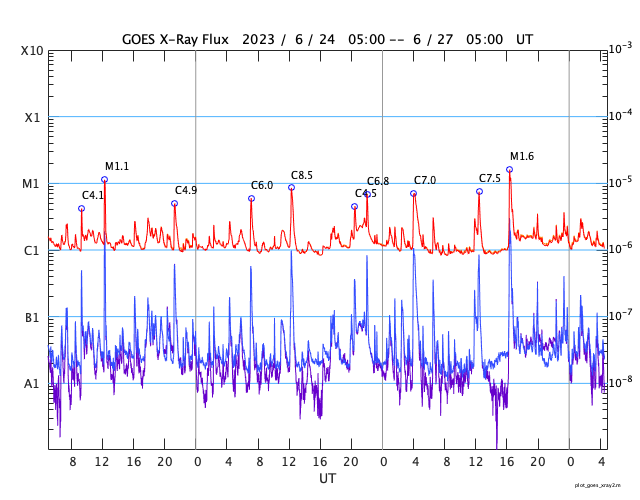 GOES衛星の太陽X線強度。赤・橙 = 0.1〜0.8 nm、青・紫 = 0.05〜0.4 nm (c) データ:NOAA/SWPC、作図:宇宙天気ニュース ![]() | ||||||||||||||||||||||||||||||||||||||||||||||||||||||||||||||||||||||||||||||||||||||||||||||||||||||||||||||||||||||||||||||||||||||||||||||||||||||||||||||||||||||||||||||||||||||||||||||||||||||||||||||||||||||||||||||||||||||||||||||||||||||||||||||||||||||||||||||||||||||||||||||||||||