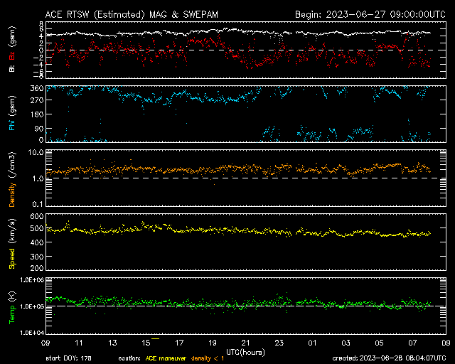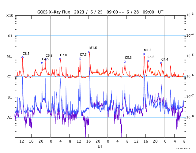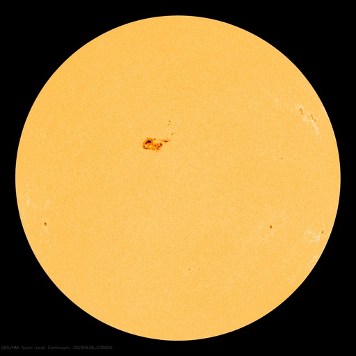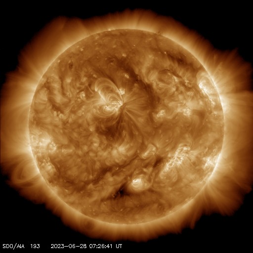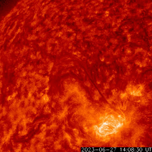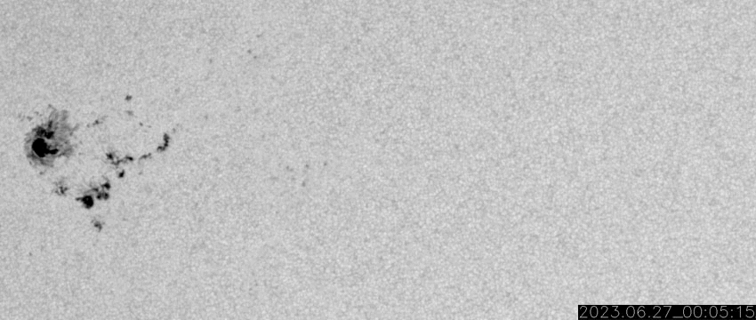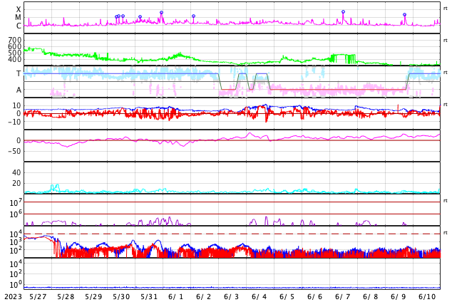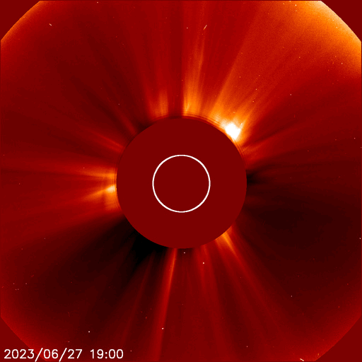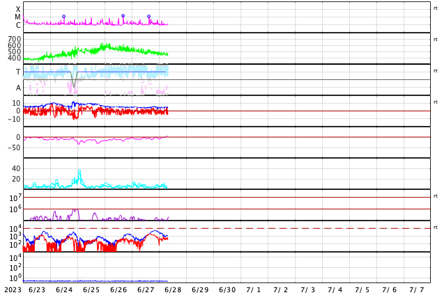 2023/ 6/28 17:04 更新 3354黒点群が大きくなっています。高速太陽風は終わっています。 担当 篠原 太陽の中心部北側の3354黒点群が、さらに大きくなっています。 昨日からの変化をSDO衛星の可視光写真の動画で紹介します。 規模はC1〜4と小規模ですが、 今朝くらいからフレアの発生も増えています。 この後、活動は強まるでしょうか。 フレアとしては、28日0時(世界時27日15時)に、 北西の端近く(右上)の3340黒点群で M1.2の中規模フレアが発生しています。 そして、28日2時(世界時27日17時)頃に、 3354黒点群付近でフィラメント噴出が発生しました。 SDO衛星AIA304の動画を掲載します。 やや見にくいですが、黒い筋が左上に噴き上がる様子が見えています。 この噴出により、SOHO衛星LASCO C2、C3では、 太陽の左上にCME(コロナ質量放出)が広がっています。 発生地点が太陽の中心に近いので、 磁場の強まりなどの太陽風の乱れが 地球へもやって来るかもしれません。 太陽風は、速度が450km/秒へ下がり、 高速の状態は終わっています。 磁場強度は、5nTと平均的な状態です。 磁場の南北成分は、弱い南寄りが続いていて、 AE指数は、300〜700nTくらいの変化が繰り返し発生しています。 速度が下がってきたので、この後の変化は小さくなりそうです。 今日も更新が遅くなり申し訳ありません。 水曜日は、7月終わりまでは遅い時間になりそうです。 ![]() 3354黒点群のこの1日の発達の様子。 (c) SDO衛星HMII (NASA)、(動画加工 : 宇宙天気ニュース) ![]() 太陽の中心部北東側で発生したフィラメント噴出。 (c) SDO衛星AIA304、(動画加工 : 宇宙天気ニュース) ![]() 太陽の左上に広がるCME。 (c) SOHO衛星LASCO C2、C3 (ESA & NASA)、(動画加工 : 宇宙天気ニュース) ![]() SDO衛星のAIA193カメラによる太陽コロナの様子 (c) SDO (NASA) ![]() SDO衛星による太陽の可視光写真。マウスの矢印を写真に重ねると、黒点番号付きの写真に切り替わります。 (c) SDO (NASA) ![]() GOES衛星の太陽X線強度。赤・橙 = 0.1〜0.8 nm、青・紫 = 0.05〜0.4 nm (c) データ:NOAA/SWPC、作図:宇宙天気ニュース ![]() ACEが観測した太陽風の磁場(1番上の枠、白線は全体の強度、赤線は南北成分) および、太陽風の密度(3番目の橙線)、速度(4番目の黄線) (c) NOAA/SWPC ![]() AE指数(速報値) 下段のAEグラフの値が高くなると、オーロラ活動が活発化しています。 (c) 京都大学WDC ![]() ![]() 27日の太陽周期に合わせた図 太陽が同じ面を地球に向けていた27日前の変化から、今後を予想することができます。 (c) 作図:宇宙天気ニュース