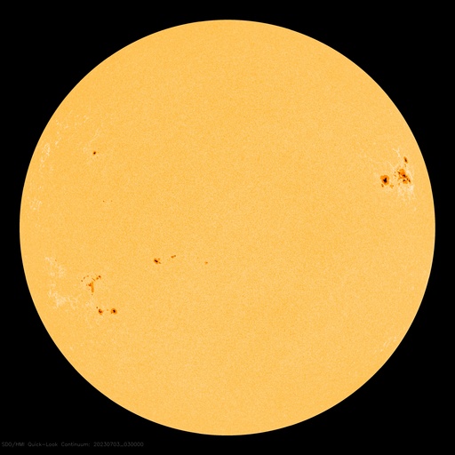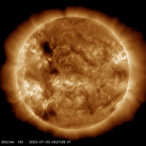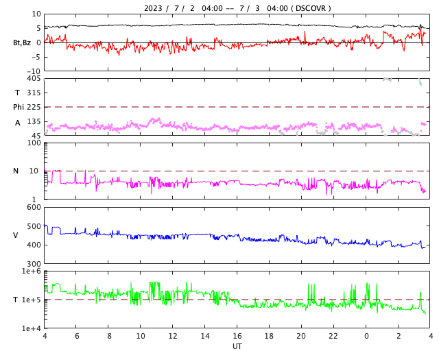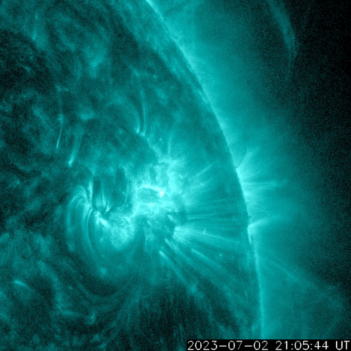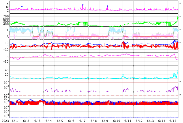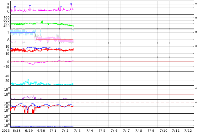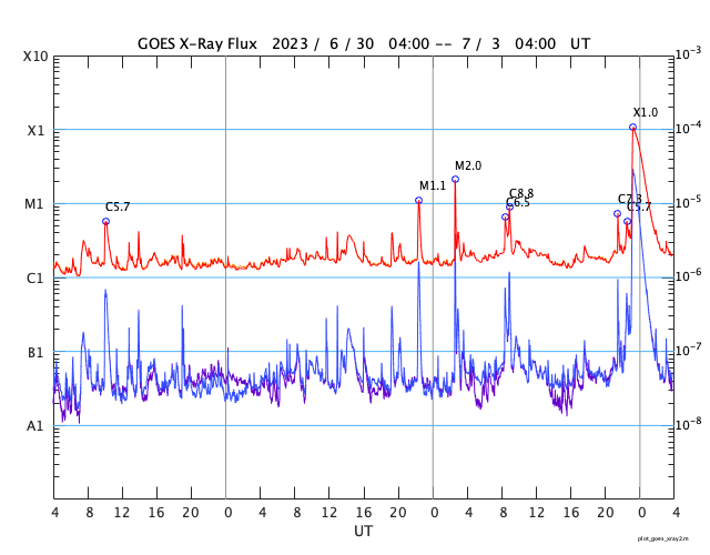 2023/ 7/ 3 12:57 更新 X1.0の大規模フレアが発生しました。太陽風は平均的な状態です。 担当 篠原 今朝、3日9時(世界時3日0時)に、 太陽の北西の端近く(右上)の3354黒点群で、 X1.0の大規模フレアが発生しました。 SDO衛星AIA131の動画を掲載します。 Xクラスのフレアの発生は、 世界時6月20日のX1.1以来で、およそ10日ぶりです。 3354群では、昨日の夕方にC6.5、C8.8と 大きめのCクラスフレアが発生していましたが、 そこから一気にXクラスの発生となりました。 SOHO衛星LASCO C2を見ると、 分かるほどのCME(コロナ質量放出)の発生はなかった様です。 3354群は、この後の活動はどうなるでしょうか。 太陽風は、速度が450km/秒から400km/秒へ少し下がっています。 平均的な状態は続いています。 磁場強度も6nTと平均的な値で安定しています。 磁場の南北成分は、0nT付近で小さく変化しています。 磁気圏は基本的に穏やかで、 AE指数は小規模の変化が起きている程度です。 ![]() 3354黒点群で発生したX1.0の大規模フレア。 (c) SDO衛星AIA131 (NASA)、(動画加工 : 宇宙天気ニュース) ![]() SDO衛星のAIA193カメラによる太陽コロナの様子 (c) SDO (NASA) ![]() SDO衛星による太陽の可視光写真。マウスの矢印を写真に重ねると、黒点番号付きの写真に切り替わります。 (c) SDO (NASA) ![]() GOES衛星の太陽X線強度。赤・橙 = 0.1〜0.8 nm、青・紫 = 0.05〜0.4 nm (c) データ:NOAA/SWPC、作図:宇宙天気ニュース ![]() DSCOVRが観測した太陽風の磁場(黒線は全体の強度、赤線は南北成分) 磁場の向き、プラズマの密度、速度、温度 (c) データ:NOAA/SWPC、作図:宇宙天気ニュース ![]() AE指数(速報値) 下段のAEグラフの値が高くなると、オーロラ活動が活発化しています。 (c) 京都大学WDC ![]() ![]() 27日の太陽周期に合わせた図 太陽が同じ面を地球に向けていた27日前の変化から、今後を予想することができます。 (c) 作図:宇宙天気ニュース