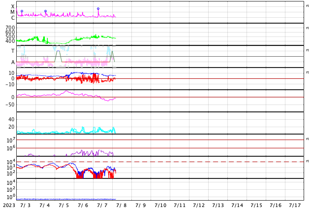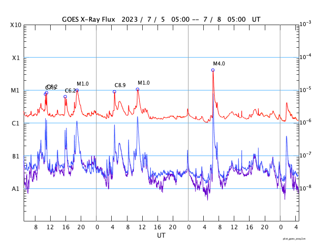 GOES衛星の太陽X線強度。赤・橙 = 0.1〜0.8 nm、青・紫 = 0.05〜0.4 nm (c) データ:NOAA/SWPC、作図:宇宙天気ニュース ![]() | |||||||||||||||||||||||||||||||||||||||||||||||||||||||||||||||||||||||||||||||||||||||||||||||||||||||||||||||||||||||||||||||||||||||||||||||||||||||||||||||||||||||||||||||||||||||||||||||||||||||||||||||||||||||||||||||||||||||||||||||||||||||||||||||||||||||||