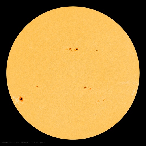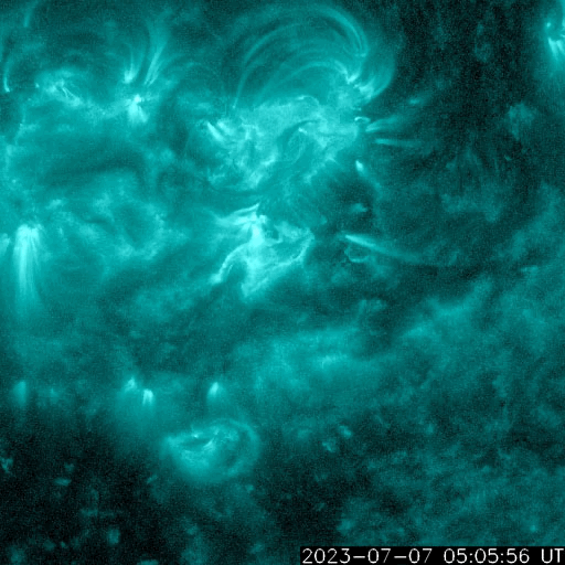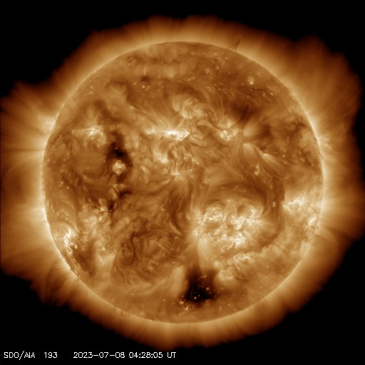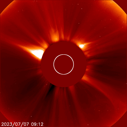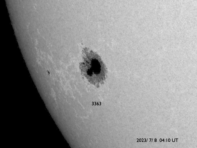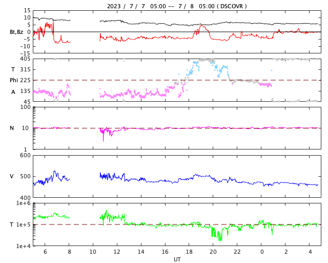 2023/ 7/ 8 13:59 更新 太陽風磁場が南向きになり、磁気圏の活動が強まりました。 担当 篠原 太陽風は、速度が480km/秒から460km/秒へ少し下がっています。 磁場強度は、10nTの強まりが終わって、 現在は6nTと平均的な状態に戻っています。 磁場の南北成分は、7日16時(世界時7日8時)頃に -8nTと南向きに強まる変化が発生し、 以降、今朝まで南向きの傾向が続いていました。 5日のニュースでお知らせした CMEに関係する変化かもしれません。 このため磁気圏の活動も強まって、 AE指数は、1000nT前後の大きい変化が、 今朝にかけて繰り返し発生しています。 現在は磁場の南北成分は0nT付近と小さくなっていて、 磁気圏も穏やかになっています。 SDO衛星AIA193では、 南半球のコロナホールが西側に進んでいます。 緯度は高めですが、太陽風の変化はやって来るでしょうか。 太陽の中心部南西側の3359黒点群で、 昨日の午後、7日15時半(世界時7日6時半)に M4.0の中規模フレアが発生しました。 SDO衛星AIA131の動画を掲載します。 3359群では、2日のM2.0以来、 5日ぶりのMフレアです。 そして、昨夜、7日19時(世界時7日10時)に、 太陽の西側(右端)でCME(コロナ質量放出)が発生しています。 太陽のこちら側では特に現象が発生していないので、 向こう側に進んだ3354群で活動が発生したのかもしれません。 SOHO衛星LASCO C2、C3の動画を掲載します。 CMEは連続して2つ発生している様に見えます。 太陽の南東の端(左下)では、 3363群の大きな黒点が目立っています。 SDO衛星による拡大写真を掲載します。 フレアは特に発生していません。 ![]() 3359黒点群で発生したM4.0の中規模フレア。 (c) SDO衛星AIA131 (NASA)、(動画加工 : 宇宙天気ニュース) ![]() 太陽の右側に広がるCME。 (c) SOHO衛星LASCO C2、C3 (ESA & NASA)、(動画加工 : 宇宙天気ニュース) ![]() 3363黒点群の拡大写真。 (c) SDO衛星 (NASA)、作図:宇宙天気ニュース ![]() SDO衛星のAIA193カメラによる太陽コロナの様子 (c) SDO (NASA) ![]() SDO衛星による太陽の可視光写真。マウスの矢印を写真に重ねると、黒点番号付きの写真に切り替わります。 (c) SDO (NASA) ![]() DSCOVRが観測した太陽風の磁場(黒線は全体の強度、赤線は南北成分) 磁場の向き、プラズマの密度、速度、温度 (c) データ:NOAA/SWPC、作図:宇宙天気ニュース ![]() AE指数(速報値) 下段のAEグラフの値が高くなると、オーロラ活動が活発化しています。 (c) 京都大学WDC ![]() ![]() 27日の太陽周期に合わせた図 太陽が同じ面を地球に向けていた27日前の変化から、今後を予想することができます。 (c) 作図:宇宙天気ニュース