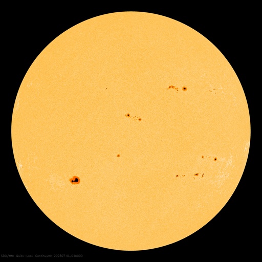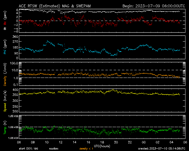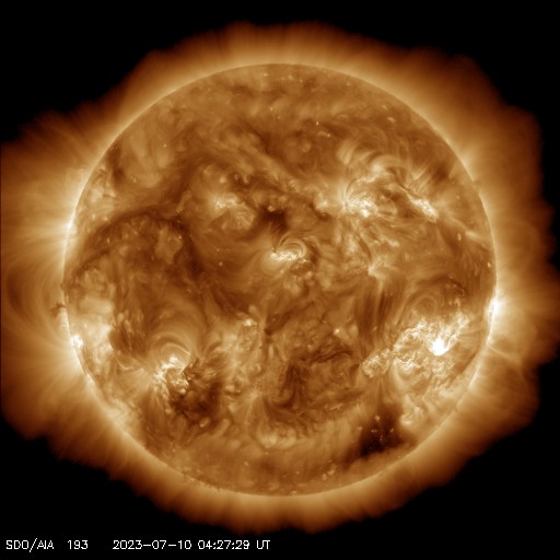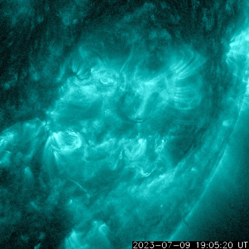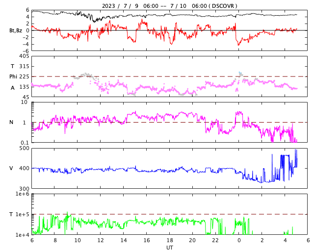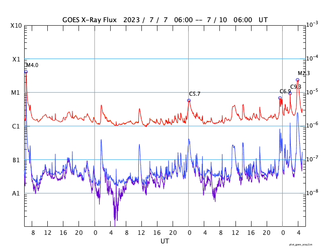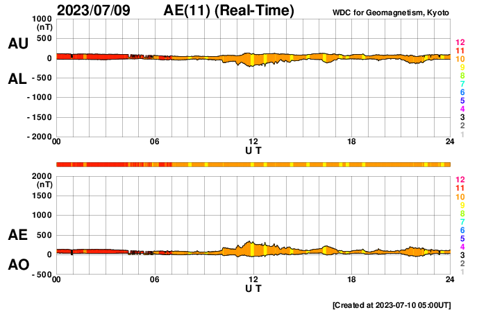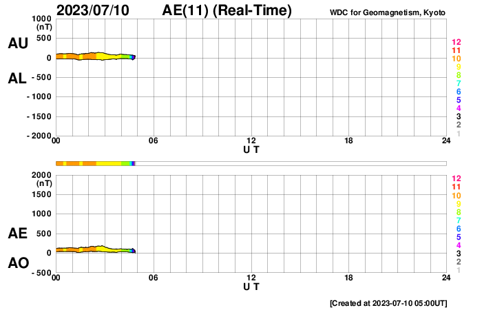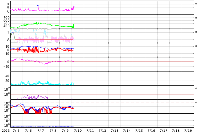 2023/ 7/10 14:15 更新 M2.3の中規模フレアが発生しました。太陽風は低速になっています。 担当 篠原 太陽の南西側(右下)の3358黒点群付近で、 10日12時半(世界時10日3時半)に M2.3の中規模フレアが発生しました。 太陽の南西側では、 昨夜から3368黒点群が新しく現れて大きくなり、 それとともに、周囲の3358群、3366群で Cクラスの小規模フレアが発生する様になっていました。 今朝以降のこの領域の活動の様子を SDO衛星AIA131の動画で紹介します。 最後に明るく輝いているのが、M2.3のフレアです。 引き続き注目してください。 太陽風は、DSCOVR衛星の速度のグラフが後半で乱れているので、 ACE衛星のグラフも掲載します。 こちらを参照すると、370km/秒とやや低速の状態から、 今朝くらいから350km/秒へ下がって、 低速の風になっている様です。 磁場強度は、5nTと平均的な状態です。 磁気圏は概ね静穏で、 AE指数は、小規模の変化が見られる程度です。 SDO衛星AIA193では、 南半球のコロナホールは南西の端に近付いています。 特に影響のないままでしょうか。