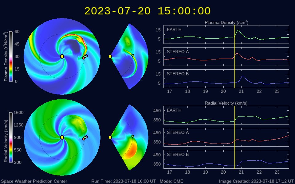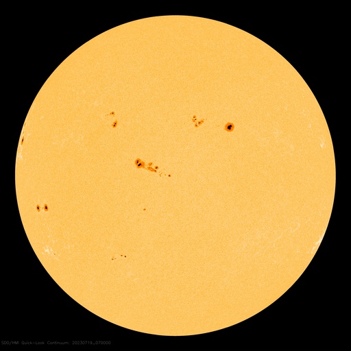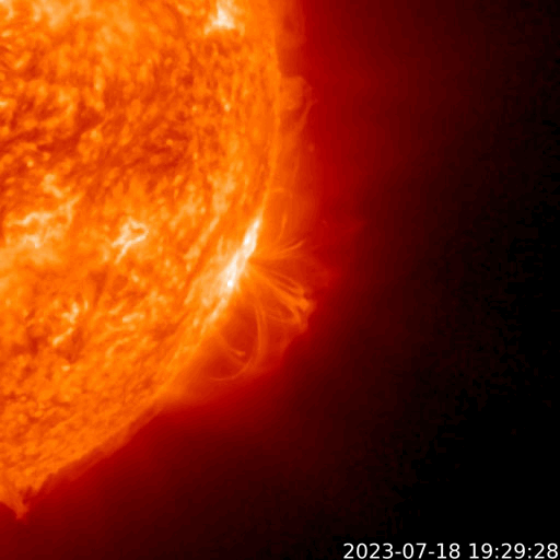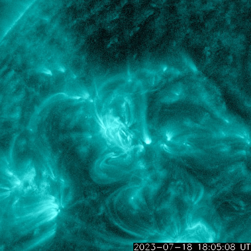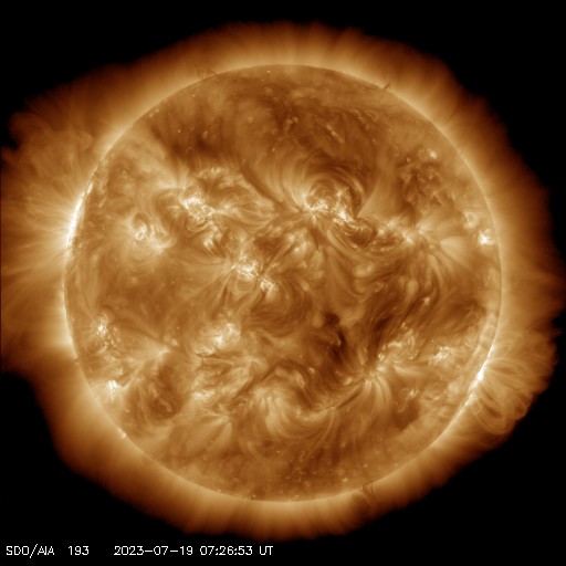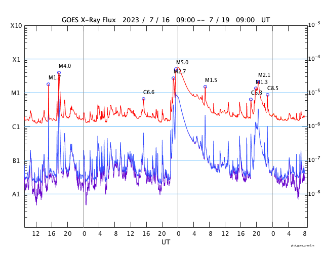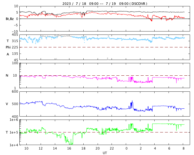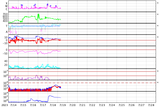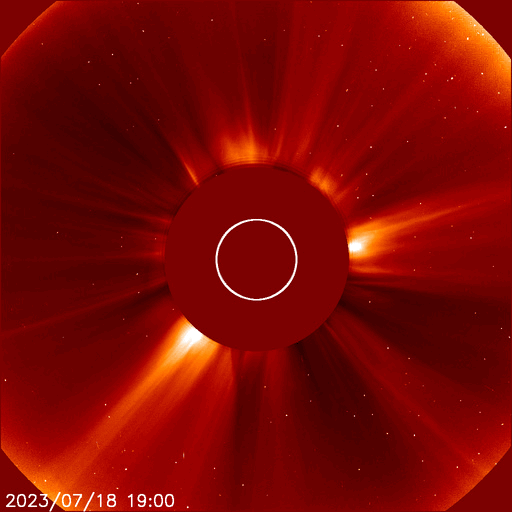 2023/ 7/19 17:29 更新 M1.4、M2.1の中規模フレアが発生しています。太陽風は平均的な状態です。 担当 篠原 昨日紹介したM5.7中規模フレアの CME(コロナ質量放出)による太陽風の乱れについて、 NOAA/SWPCの予報では、 21日0時(世界時20日15時)頃の到来と考えています。 明日の深夜です。 注目してください。 太陽では、今朝、19日4時半と5時(世界時18日19時半と20時)に、 北東側(左上)の3376黒点群で、 M1.3とM1.4の中規模フレアが発生しました。 SDO衛星AIA131の動画を掲載します。 ほとんど同時の19日5時半(世界時18日20時半)には、 南西の端(右下)の3363群で、 M2.1の中規模フレアが発生しています。 こちらはGOES衛星SUVI 304の動画を掲載します。 フレアに伴って、コロナが噴き上がっている様子が見えています。 これらの活動により、SOHO衛星LASCO C2、C3では、 太陽の左上側と右側の両方にCMEが飛び出しています。 動画では、ガスが太陽を丸く囲む様に広がって見えますが、 2つのCMEが重なっているためだと思います。 左上に向かうCMEは、地球に対して斜め方向ですが、 太陽風の変化は地球へやって来るかもしれません。 530km/秒と高速だった太陽風は、 昨夜遅くに500km/秒台を割り、 現在は450km/秒程度と平均的な状態に戻っています。 磁場強度も、5〜6nTと平均的な状態です。 磁場の南北成分は、 昨日のニュース以降は北寄りになり、 磁気圏は穏やかになっています。 AE指数は変化が見られなくなっています。 ![]() 18日朝のCMEによる太陽風の乱れは、21日0時(世界時20日15時)頃に到来する可能性があります。 (c) SDO衛星AIA131 (NASA)、(動画加工 : 宇宙天気ニュース) ![]() 3376黒点群で発生したM1.3、M1.4の中規模フレア。 (c) SDO衛星AIA131 (NASA)、(動画加工 : 宇宙天気ニュース) ![]() 3363黒点群で発生したM2.1の中規模フレア。 (c) GOES衛星SUVI 304 (NOAA)、(動画加工 : 宇宙天気ニュース) ![]() 太陽の左上と右側に飛び出すCME。 (c) SOHO衛星LASCO C2、C3 (ESA & NASA)、(動画加工 : 宇宙天気ニュース) ![]() SDO衛星のAIA193カメラによる太陽コロナの様子 (c) SDO (NASA) ![]() SDO衛星による太陽の可視光写真。マウスの矢印を写真に重ねると、黒点番号付きの写真に切り替わります。 (c) SDO (NASA) ![]() GOES衛星の太陽X線強度。赤・橙 = 0.1〜0.8 nm、青・紫 = 0.05〜0.4 nm (c) データ:NOAA/SWPC、作図:宇宙天気ニュース ![]() DSCOVRが観測した太陽風の磁場(黒線は全体の強度、赤線は南北成分) 磁場の向き、プラズマの密度、速度、温度 (c) データ:NOAA/SWPC、作図:宇宙天気ニュース ![]() AE指数(速報値) 下段のAEグラフの値が高くなると、オーロラ活動が活発化しています。 (c) 京都大学WDC ![]() ![]() 27日の太陽周期に合わせた図 太陽が同じ面を地球に向けていた27日前の変化から、今後を予想することができます。 (c) 作図:宇宙天気ニュース