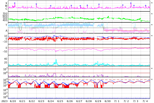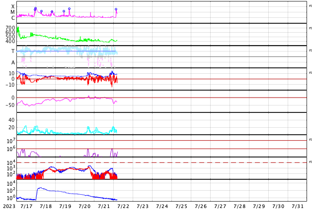 2023/ 7/17 14:31 太陽風の乱れが到来し、磁気圏の活動が一時的に強まりました。