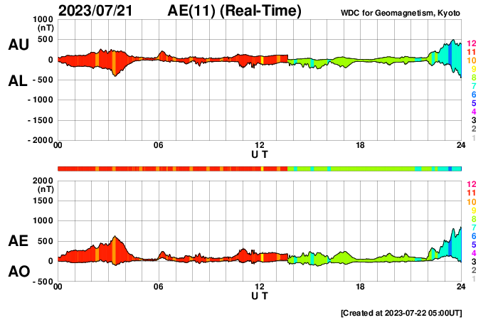 下段のAEグラフの値が高くなると、オーロラ活動が活発化しています。
