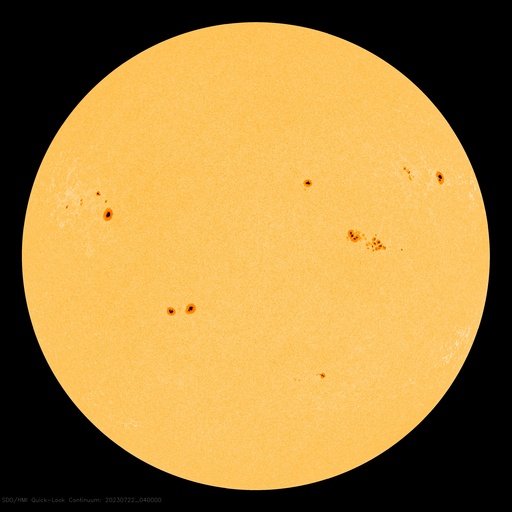 SDO衛星による太陽の可視光写真。マウスの矢印を写真に重ねると、黒点番号付きの写真に切り替わります。