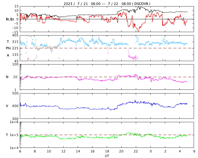 2023/ 7/21 13:31 太陽風の小規模の乱れが到来しました。現在の太陽風は平均的な状態です。