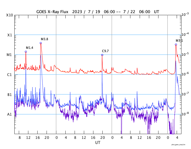2023/ 7/20 16:28 太陽風は平均的な状態です。M3.8の中規模フレアが発生しています。