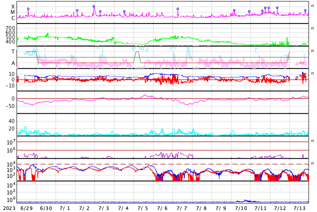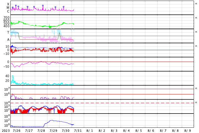 2023/ 7/26 15:56 CMEによる太陽風の急な変化が到来しました。磁気圏の活動も強まっています。