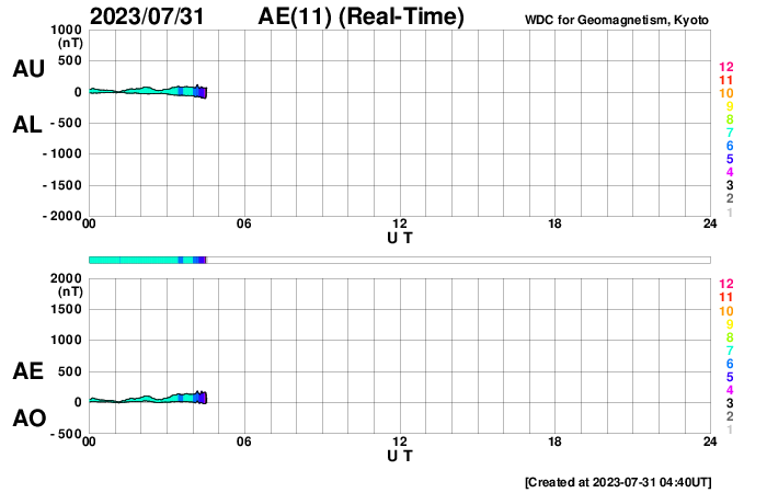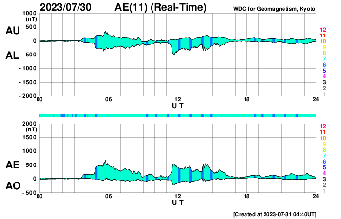 下段のAEグラフの値が高くなると、オーロラ活動が活発化しています。