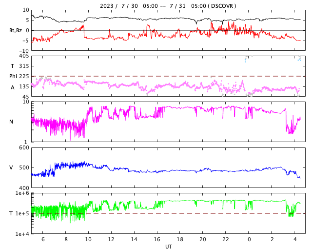 2023/ 7/27 13:55 太陽風速度の高まりが続いています。磁気圏は穏やかです。