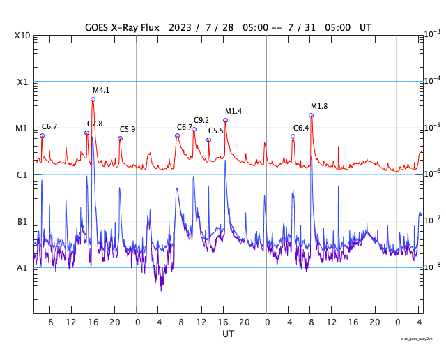 GOES衛星の太陽X線強度。赤・橙 = 0.1〜0.8 nm、青・紫 = 0.05〜0.4 nm