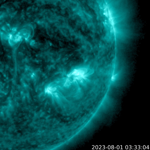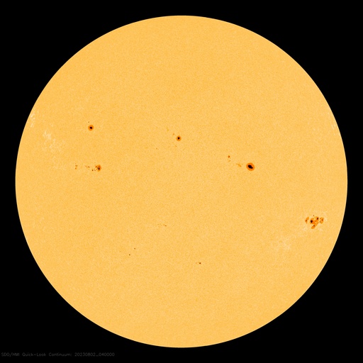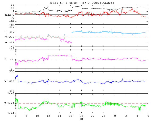 2023/ 8/ 2 14:43 更新 太陽風磁場の強まりが到来しています。磁気圏は穏やかです。 担当 篠原 太陽風は、5nTと平均的な状態だった磁場強度が、 2日1時(世界時1日16時)頃に12nTへ急に強まり、 以降、10nT前後で推移しています。 速度は目立った変化はなく、 380〜400km/秒と平均的な状態です。 7月30日のニュースでお知らせした CME(コロナ質量放出)による太陽風の変化が 予報よりも半日ほど遅くなりましたが、 やって来たのかもしれません。 その場合、太陽から地球まで4日弱かかったことになります。 現在の太陽風の速度を考えると、妥当な範囲だと思います。 磁場の南北成分は、グラフの中盤で弱い南寄りになり、 磁場が強まった後は、北寄りの傾向になっています。 オーロラの活動度を示すAE指数のグラフは、 中盤で500nTの変化がしばらく続いていますが、 その後は変化がなくなっています。 現在の磁気圏は穏やかです。 太陽風磁場の強まりはどのくらい続くでしょうか。 太陽は、南西(右下)の3380黒点群の活動が目立っていて、 昨日のニュース以降、 M3.6、M1.5、M1.4、M1.0と 中規模フレアが発生しています。 このため、X線グラフは変化が頻繁に起きています。 太陽の南東の端(左下)の向こう側にも 活動的な領域があるようです。 この後、どの様な黒点が現れるでしょうか。 ![]() 3080黒点群で発生するフレアの様子。 (c) GOES衛星SUVI 131 (NOAA)、(動画加工 : 宇宙天気ニュース) ![]() SDO衛星のAIA193カメラによる太陽コロナの様子 (c) SDO (NASA) ![]() SDO衛星による太陽の可視光写真。マウスの矢印を写真に重ねると、黒点番号付きの写真に切り替わります。 (c) SDO (NASA) ![]() DSCOVRが観測した太陽風の磁場(黒線は全体の強度、赤線は南北成分) 磁場の向き、プラズマの密度、速度、温度 (c) データ:NOAA/SWPC、作図:宇宙天気ニュース ![]() AE指数(速報値) 下段のAEグラフの値が高くなると、オーロラ活動が活発化しています。 (c) 京都大学WDC ![]() ![]() 27日の太陽周期に合わせた図 太陽が同じ面を地球に向けていた27日前の変化から、今後を予想することができます。 (c) 作図:宇宙天気ニュース