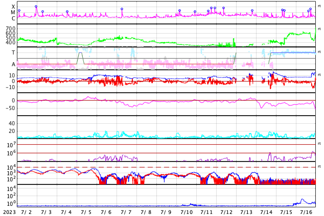 2023/ 7/31 13:48 太陽風はやや高速の状態です。太陽は比較的落ち着いています。