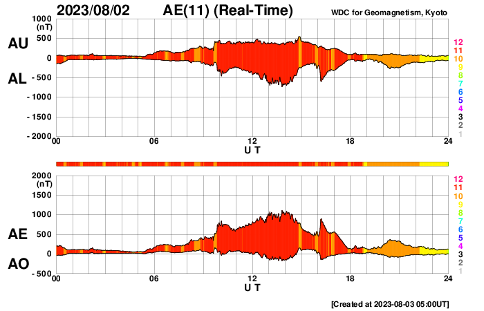 下段のAEグラフの値が高くなると、オーロラ活動が活発化しています。