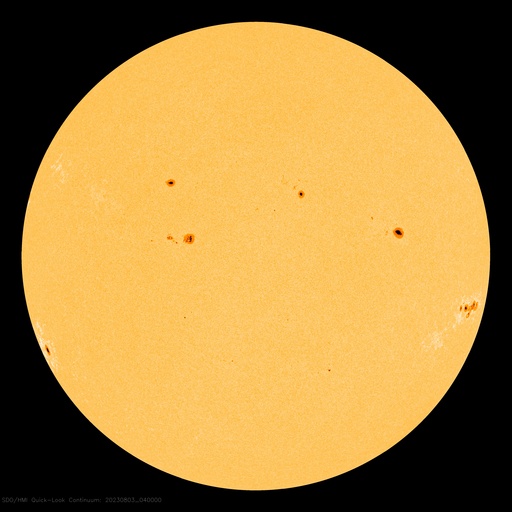 SDO衛星による太陽の可視光写真。マウスの矢印を写真に重ねると、黒点番号付きの写真に切り替わります。