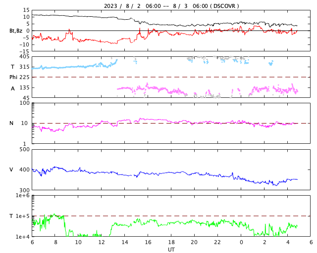 2023/ 8/ 2 14:43 太陽風磁場の強まりが到来しています。磁気圏は穏やかです。