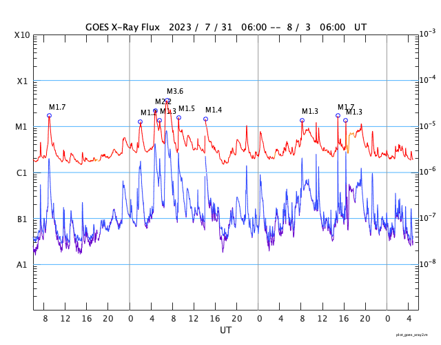 GOES衛星の太陽X線強度。赤・橙 = 0.1〜0.8 nm、青・紫 = 0.05〜0.4 nm