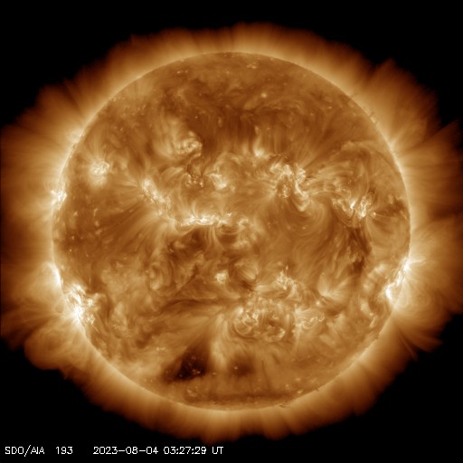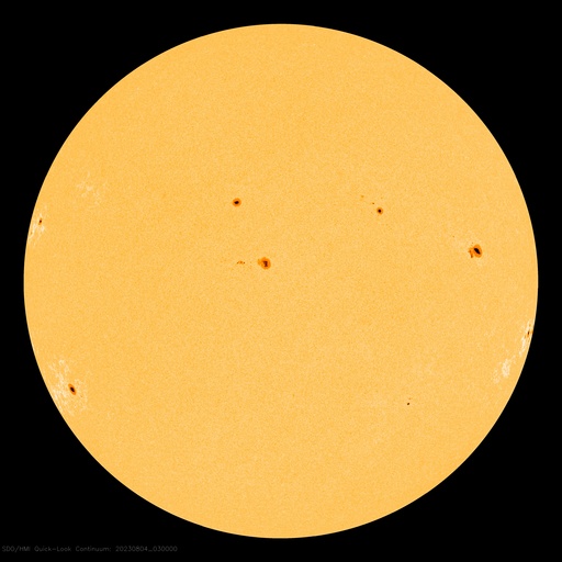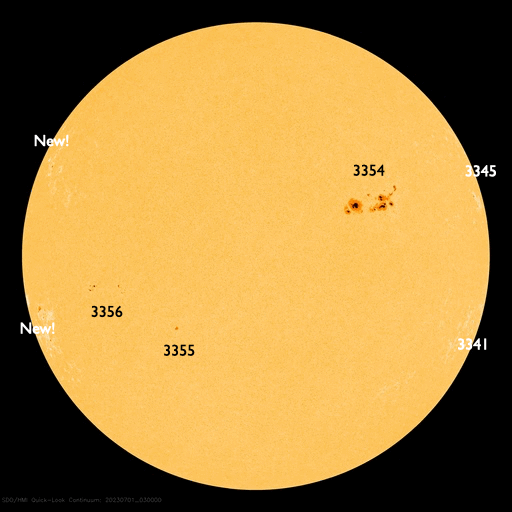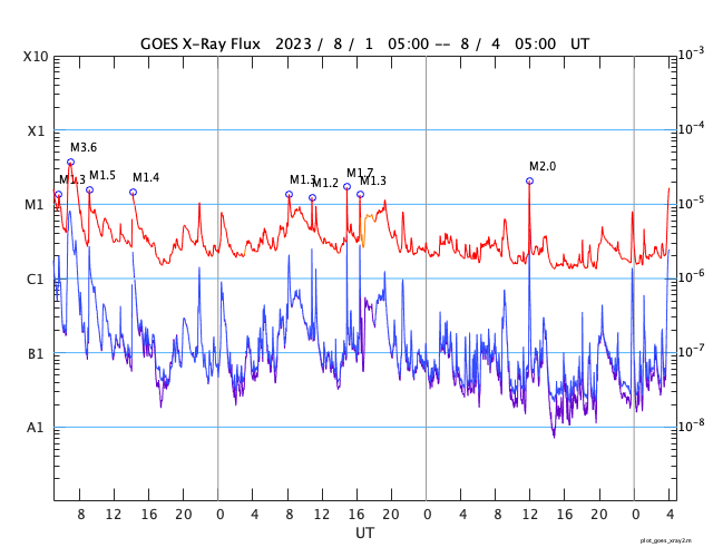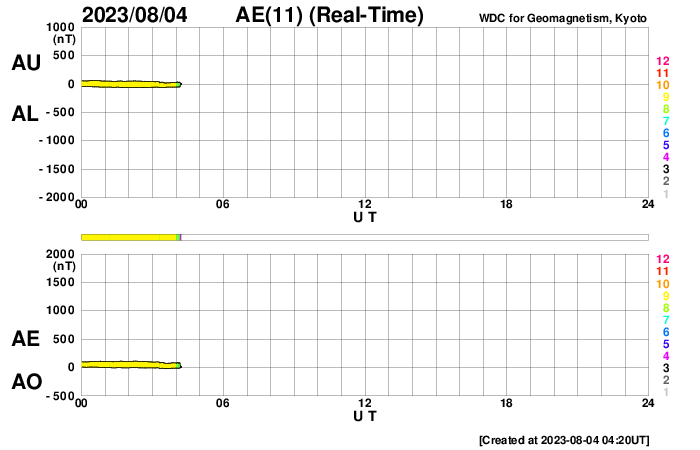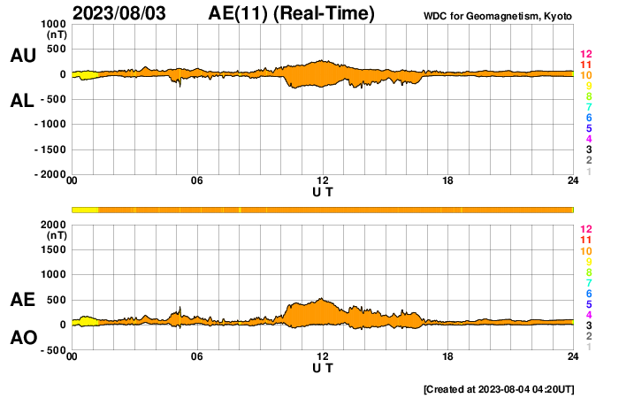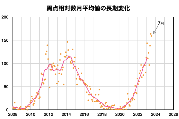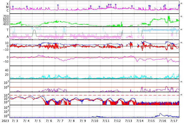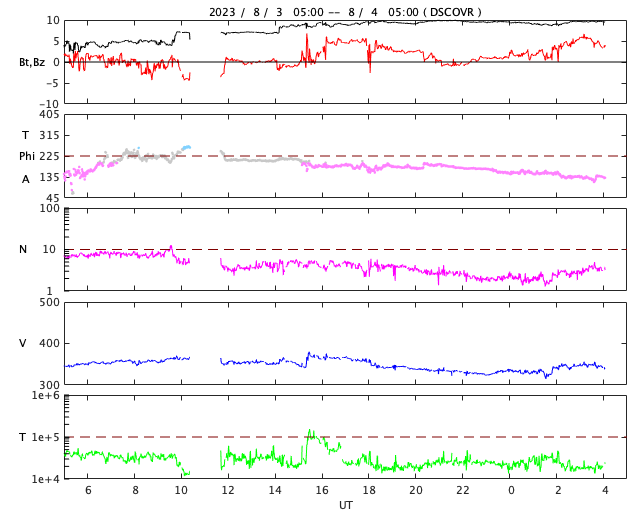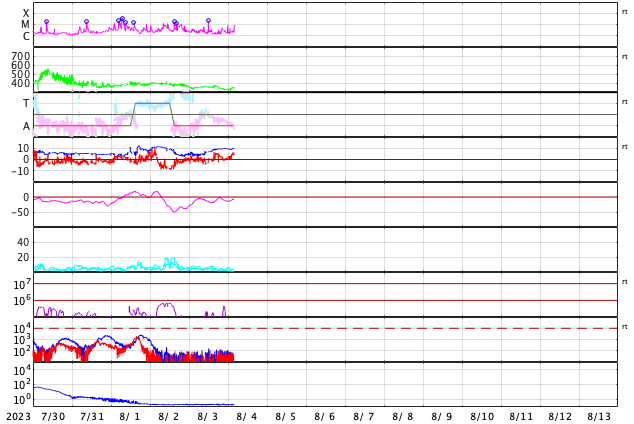2023/ 8/ 4 13:20 更新 太陽風は低速で、磁気圏も穏やかです。7月の黒点相対数は 159.1 でした。 担当 篠原 7月の黒点相対数は 159.1 と、WDC-SILSOより発表されています。 6月の163.4に続いて、 24期の最高値である146.1を上回る値になっています。 7月は、1日値の最低値が15日の129と大きくは下がらず、 1か月を通して安定して黒点が現れ続けた様です。 1か月間の動画を見ても、常に多くの黒点が見えています。 参考に、月平均値が今期最高となった6月では、 13日に91に下がっています。 現在の太陽は、 フレアが続いていた3380黒点群が南西の端(右下)に達して、 この後見えなくなります。 昨夜、3日21時(世界時3日12時)に発生したM2.0の中規模フレアが、 今のところ最後のMクラスになっています。 その他の領域では、C2〜3の小規模フレアが発生した程度で、 太陽は穏やかになりそうです。 太陽風は、昨夕、3日18時半(世界時3日9時半)に、 磁場強度が5nTから7nTへ急に強まり、 その後、半日ほどかけて10nTへ強まる変化が発生しています。 変化としては、特に大きいものではありません。 速度は350km/秒前後と低速の状態が続いています。 磁場の南北成分は、0nT付近か北向きに変化しています。 磁気圏は穏やかで、 AE指数は一時的に500nTの変化が発生していますが、 その後は変化がなくなっています。