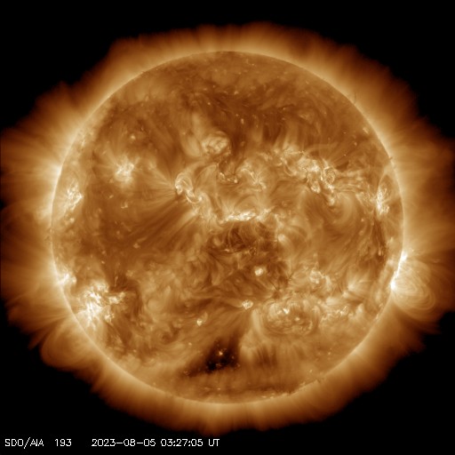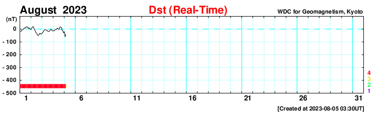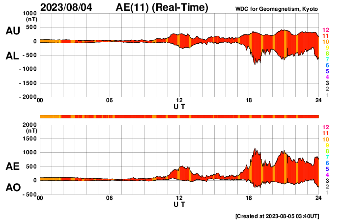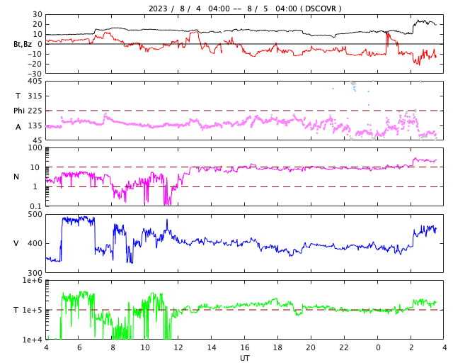 2023/ 8/ 5 12:41 更新 太陽風磁場が強まり、磁気圏の活動も強まっています。 担当 篠原 10nTに強まっていた太陽風の磁場が、さらに強まっています。 初めの変化は、昨夕、4日16時(世界時4日7時)で、 10nTから15nTへ急に上昇しています。 その後、半日近くこの状態が続き、 今朝くらいから10nTへ一旦下がったのですが、 5日11時(世界時5日2時)に二つ目の強まりが到来して、 磁場強度は23nTへ変化しています。 太陽風の速度は、400km/秒と平均的な状態が続いていて、 二つ目の変化で450km/秒に上昇していますが、 変化としては小幅です。 8月11日のニュースで紹介した 1日未明のフィラメント噴出により発生した CME(コロナ質量放出)の乱れが到来したのでしょうか。 その場合、到来まで4日半かかったことになります。 太陽風磁場の南北成分は、 太陽風のグラフの中ほど、 今日に入った頃から南向きに強まり始め、 -10nTに達する大きい変化が続いています。 このため、磁気圏の活動は活発になっていて、 AE指数は、1000nTに達する大きい変化が 連続的に発生しています。 Dst指数の速報値は-60nTまで変化していて (Dst指数は、マイナス方向に変化が大きくなります)、 この後、さらに変化が大きくなる可能性があります。 太陽は、北西(右上)の3386黒点群で、 M1.9の中規模フレアが発生しています。 また、グラフの最後のC9.7の小規模フレアは、 南西の端(右下)に沈んだ3380群で発生した様です。