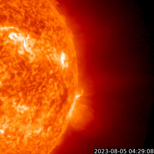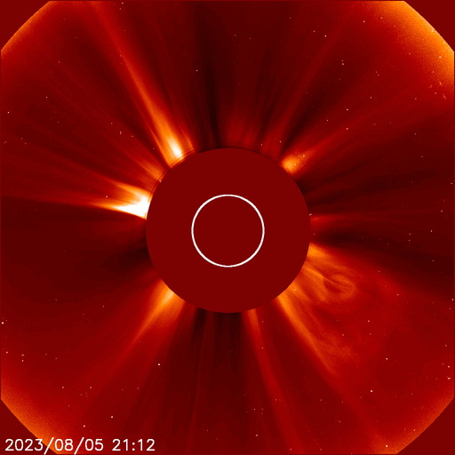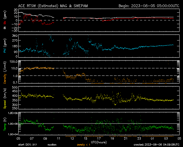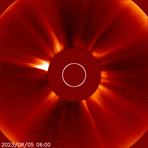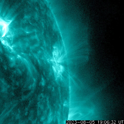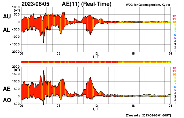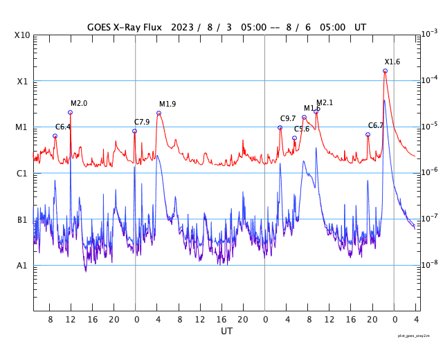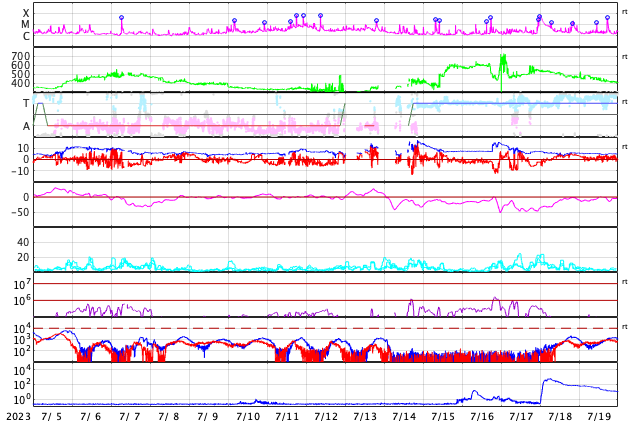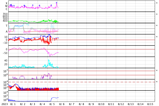 2023/ 8/ 6 13:10 更新 X1.6の大規模フレアが発生しました。太陽風磁場の強まりは終わっています。 担当 篠原 太陽の北西の端(右上)の3386黒点群で、 今朝、6日7時(世界時5日22時)に、 X1.6の大規模フレアが発生しました。 SDO衛星AIA131の動画を掲載します。 Xフレアの発生は世界時7月2日のX1.0以来で、 およそ1か月ぶりです。 SOHO衛星LASCO C2、C3では、 CME(コロナ質量放出)が右上を中心に 大きく広がっています。 太陽の端近くで発生した現象ですが、 ガスの広がり方が大きいので、 影響は地球へやって来るかもしれません。 2〜3日で到来する考えると、8〜9日頃になるかもしれません。 また、このフレアの前、 5日15時(世界時5日6時)頃に、 太陽の南西の端近くでフィラメント噴出が発生しています。 GOES衛星SUVI 304の動画を掲載します。 直前に、左上の3387黒点群でC5.6の小規模フレアが発生して、 その変化が伝わって行って、 ダークフィラメントが大きく動き始めた様に見えます。 この噴出でもCMEが発生していて、 SOHO衛星LASCO C2、C3では、 ガスが右下に激しく噴出しています。 NOAA/SWPCの太陽風予報によると、 このCMEによる太陽風の乱れは、 明後日、8日13時(世界時8日4時)頃に 到来する可能性があるとのことです。 今朝のX1.6フレアによる乱れがこれに重なる可能性もあり (こちらも含めた予報は今後発表されると思います)、 今後の太陽風の変化に注目してください。 太陽風は、昨日のニュース以降は磁場強度が次第に低下して、 夜には6nTと平均的な値に戻りました。 今日未明からまた少し上がって、 現在は8nTと少し強い状態です。 速度は400km/秒から350km/秒へ下がり、 低速になっています。 磁場の南北成分は、 磁場強度が下がった後は北寄りになっています。 AE指数は、グラフの前半は 1000nTを超える大きい変化が続いていますが、 中盤以降変化がなくなり、現在の磁気圏は穏やかです。
