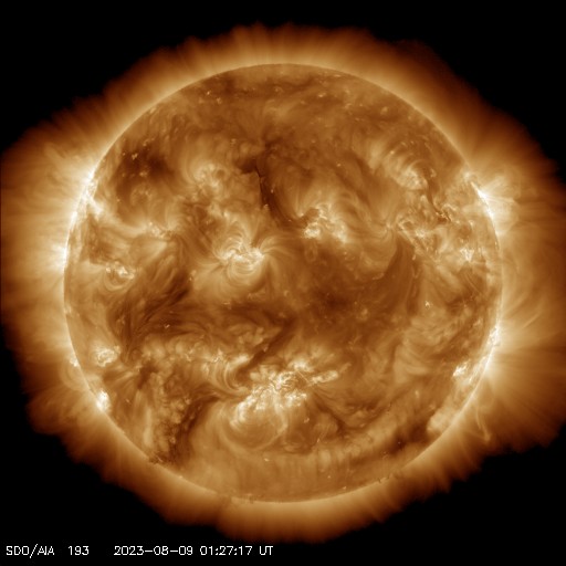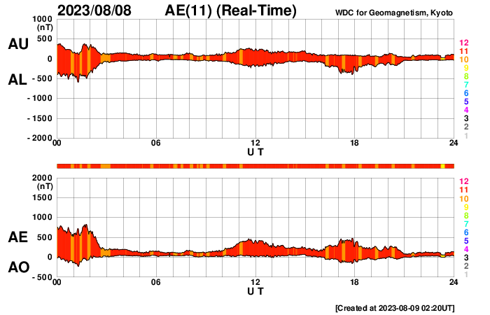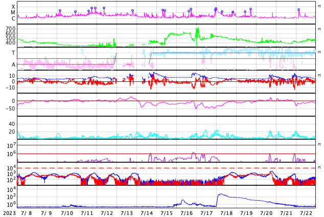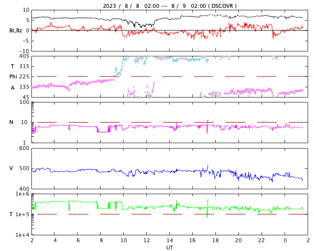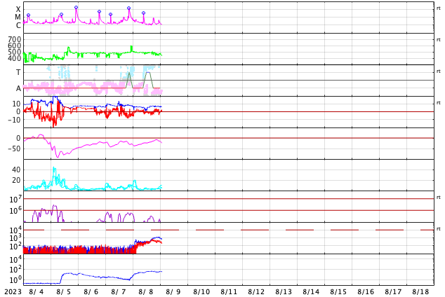 2023/ 8/ 9 11:29 更新 太陽風は平均的な速度に戻りかけています。磁気圏は穏やかです。 担当 篠原 太陽風の速度は500km/秒から450km/秒へ下がり、 高速の状態は終わりそうです。 磁場強度は、6nTから一旦3nTに下がりましたが、 その後再び7nTに上がっています。 少し強めという程度です。 磁場の南北成分は、0nT付近で小幅で変化しています。 南寄りになった時に AE指数に300nTくらいの小規模の変化が発生していますが、 全体としては磁気圏は穏やかです。 太陽は、北西の端(右上)に達していた3387黒点群で M3.6の中規模フレア、 また、中心部南側(下側)の3394黒点群で C8.7の小規模フレアが発生しています。 3387群は既に見えなくなっていて、 太陽は穏やかになっている印象です。 昨日から台風の接近により、 学校内のネットワークが停止しています。 このため、速報やグラフなど最新情報の更新が停止しています。 記事の公開は行っていますが、 ネットワークが再開する明日の昼頃まで 最新情報の更新はお待ちください。 今日は、朝から風雨が強まった状態が続いています。 台風は鹿児島の西方を通過しているので、 学校の辺りでは猛烈な風にはなっていません。