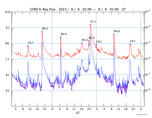 GOES衛星の太陽X線強度。赤・橙 = 0.1〜0.8 nm、青・紫 = 0.05〜0.4 nm (c) データ:NOAA/SWPC、作図:宇宙天気ニュース ![]() | |||||||||||||||||||||||||||||||||||||||||||||||||||||||||||||||||||||||||||||||||||||||||||||||||||||||||||||||||||||||||||||||||||||||||||||||||||||||||||||||||||||||||||||||||||||||||||||||||||||||||||||||||||||||||||||||||||||||||||||||||||||||||||||||||||||||||||||||||||||||