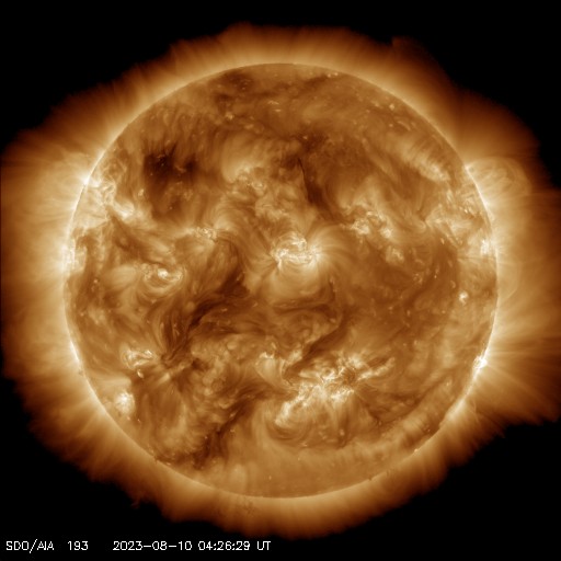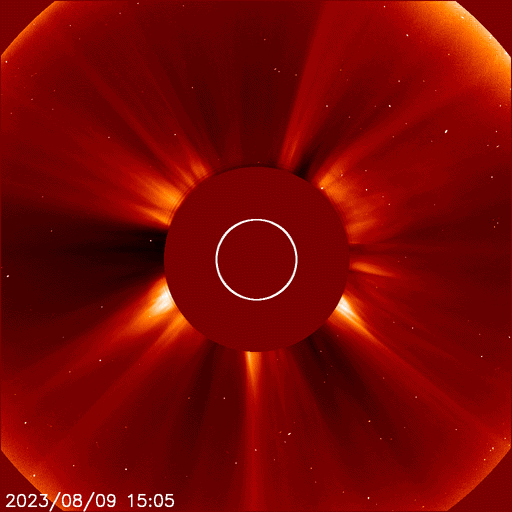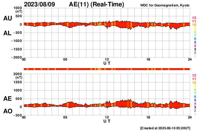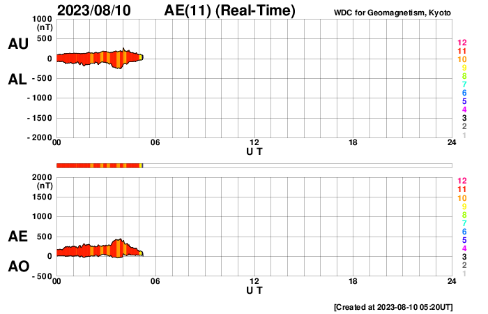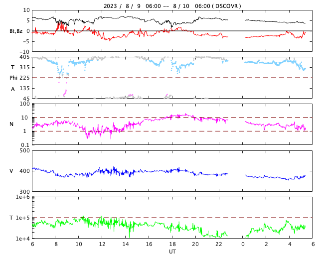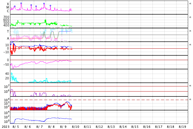 2023/ 8/10 14:35 更新 太陽風は低速になっています。太陽は比較的穏やかです。 担当 篠原 太陽風の速度は400km/秒台を割り、 最後は370km/秒と低速になっています。 磁場強度は、小幅ですが6nTから4nTへ下がっています。 平均的な状態です。 磁場の南北成分は、弱い南寄りになっています。 磁気圏では弱い活動が続いていて、 AE指数は300nT程度の変化が起きています。 太陽は、中心部南西側の3394黒点群でC4.0、 南西の端に達した3398群でC5.4の 小規模フレアが発生しています。 X線グラフの変化は少なくなっていて、 太陽は比較的落ち着いた状態です。 深夜、10日1時(世界時9日16時)に、 太陽の右下側に広がるCME(コロナ質量放出)が発生しました。 太陽のこちら側では特に変化が起きていないので、 向こう側で発生した現象の様です。 台風は通過して、今日の天気は落ち着いています。 休校が前期最後にぶつかってしまったため、 今日はとても慌ただしい状態です。