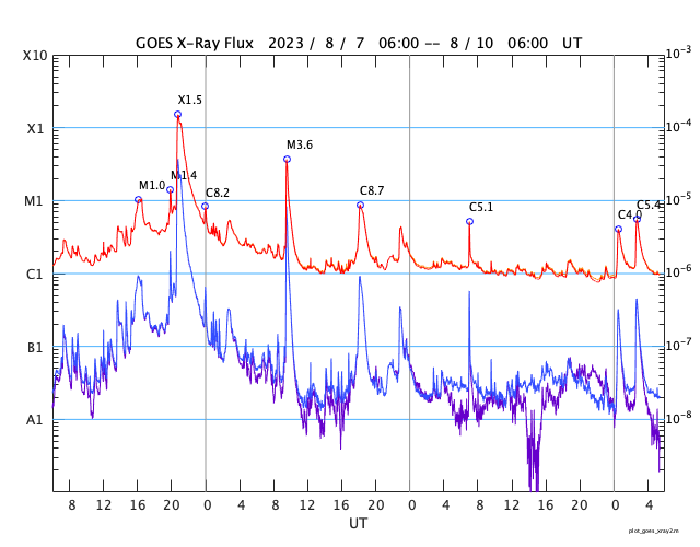 GOES衛星の太陽X線強度。赤・橙 = 0.1〜0.8 nm、青・紫 = 0.05〜0.4 nm (c) データ:NOAA/SWPC、作図:宇宙天気ニュース ![]() | ||||||||||||||||||||||||||||||||||||||||||||||||||||||||||||||||||||||||||||||||||||||||||||||||||||||||||||||||||||||||||||||||||||||||||||||||||||||||||||||||||||||||||||||||||||||||||||||||||||||||||||||||||||||||||||||||||||||||||||||||||||||||||||||||||||||||||||