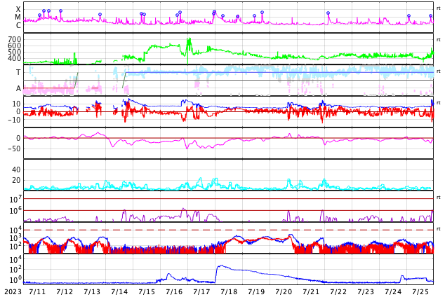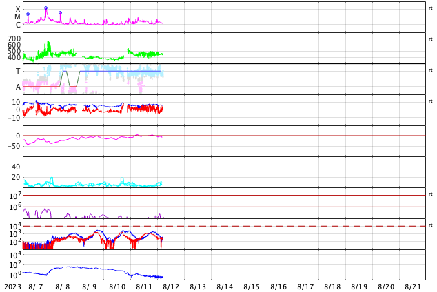 2023/ 8/ 7 14:09 M5.5の中規模フレアが発生しました。太陽風はやや低速です。