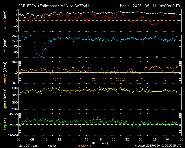2023/ 8/ 9 11:29 太陽風は平均的な速度に戻りかけています。磁気圏は穏やかです。