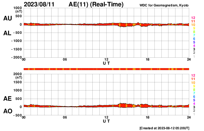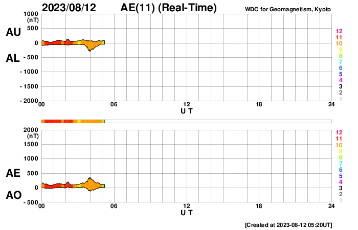 下段のAEグラフの値が高くなると、オーロラ活動が活発化しています。