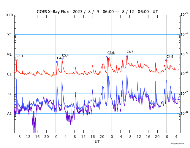 GOES衛星の太陽X線強度。赤・橙 = 0.1〜0.8 nm、青・紫 = 0.05〜0.4 nm