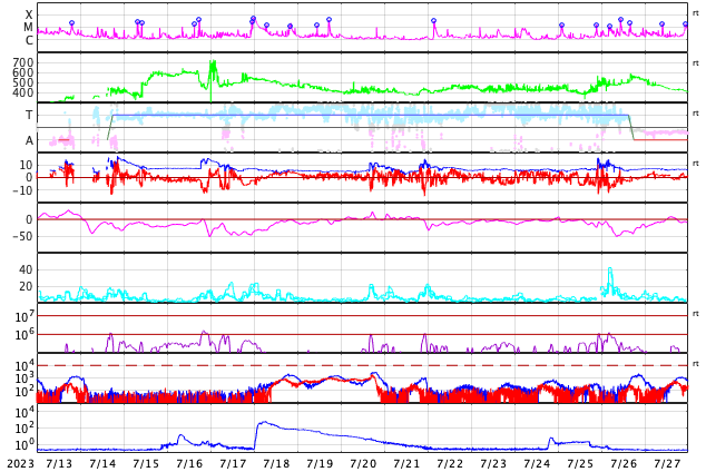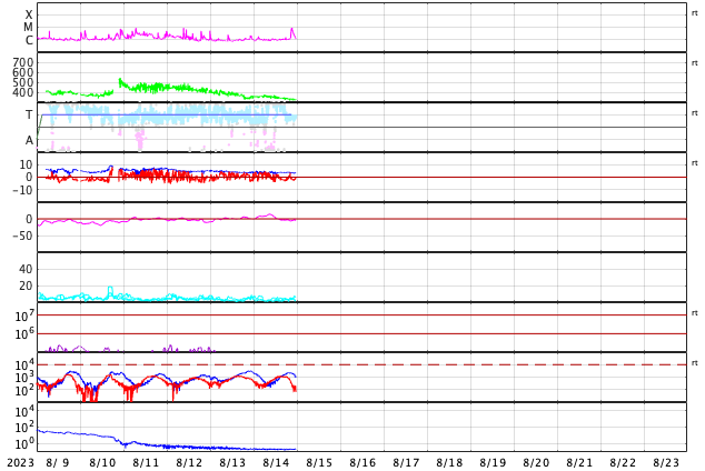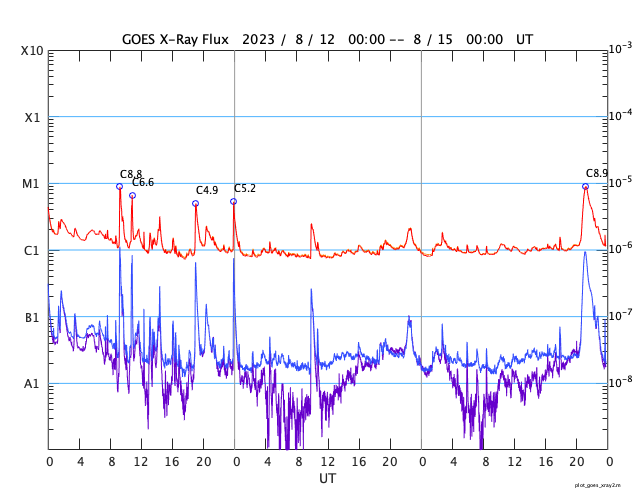 GOES衛星の太陽X線強度。赤・橙 = 0.1〜0.8 nm、青・紫 = 0.05〜0.4 nm (c) データ:NOAA/SWPC、作図:宇宙天気ニュース ![]() | ||||||||||||||||||||||||||||||||||||||||||||||||||||||||||||||||||||||||||||||||||||||||||||||||||||||||||||||||||||||||||||||||||||||||||||||||||||||||||||||||||||||||||||||||||||||||||||||||||||||||||||||||||||||||||||||||||||||