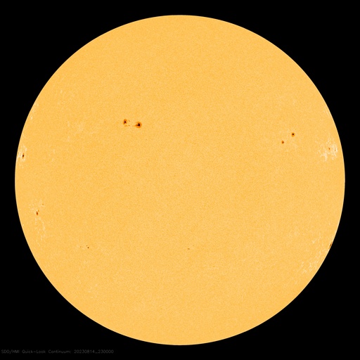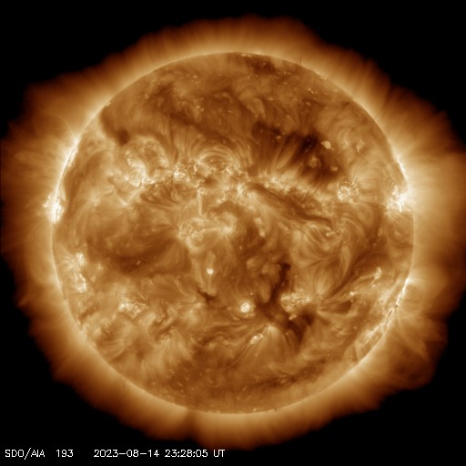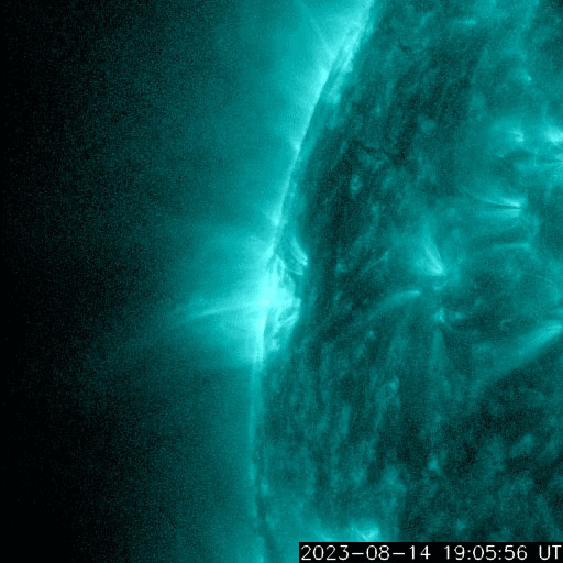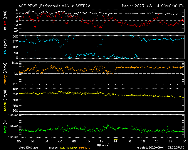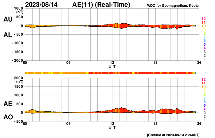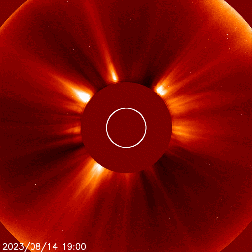 2023/ 8/15 08:56 更新 太陽風はより低速になっています。C8.9の小規模フレアが発生しました。 担当 篠原 太陽風の速度は350km/秒から320km/秒へ下がり、 より低速の状態になっています。 磁場強度は、4nTから3nTへ下がり、 こちらもより小さくなっています。 磁場の南北成分は、 グラフの中盤から南寄りに変化していますが、 -2〜-3nTと変化は小さく、 速度も下がっているので磁気圏への影響は小さく、 AE指数は、200〜300nT程度の 小規模の変化が発生している程度です。 SDO衛星AIA193では、 北半球のコロナホールが北西側(右上)に進んでいます。 明日くらいから影響がやって来るでしょうか。 太陽は、昨日のニュース以降も穏やかな状態が続いていましたが、 今朝、15日5時半(世界時14日20時半)に、 北東の端(左上)の3405黒点群で、 C8.9の小規模フレアが発生しました。 SDO衛星AIA131による動画を掲載します。 このフレアに伴って、 CME(コロナ質量放出)が太陽の左上に向かって広がっています。 横向きの噴出なので地球への影響はありません。 3405群はこの後も活動を続けるでしょうか。