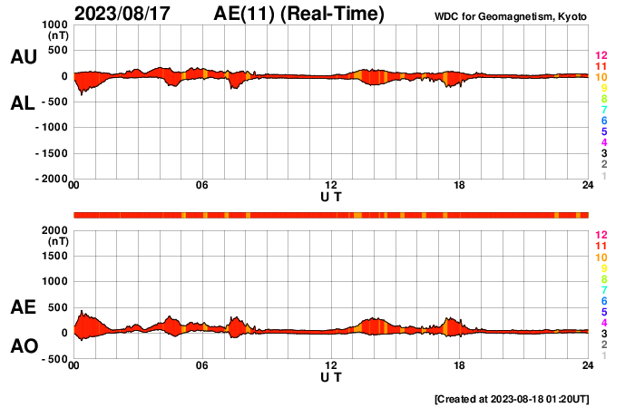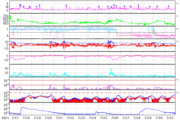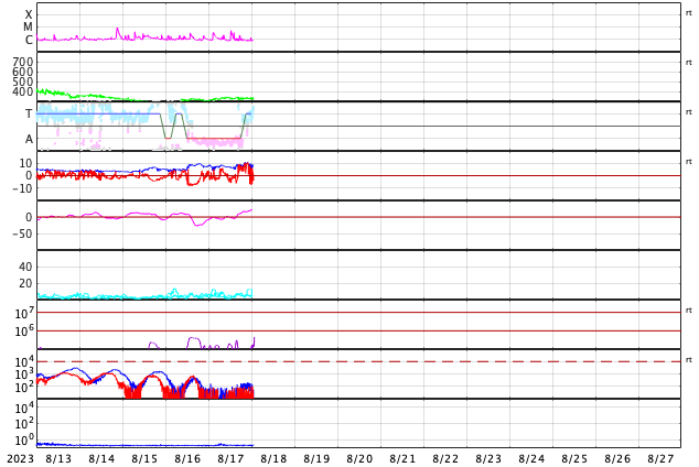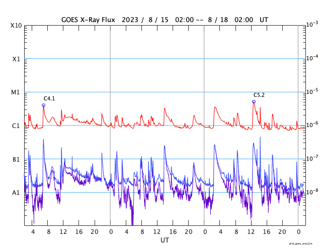 GOES衛星の太陽X線強度。赤・橙 = 0.1〜0.8 nm、青・紫 = 0.05〜0.4 nm (c) データ:NOAA/SWPC、作図:宇宙天気ニュース ![]() | ||||||||||||||||||||||||||||||||||||||||||||||||||||||||||||||||||||||||||||||||||||||||||||||||||||||||||||||||||||||||||||||||||||||||||||||||||||||||||||||||||||||||||||||||||||||||||||||||||||||||||||||||||||||||||||||||||||||||||||||||||||||||||||||||