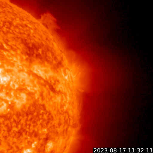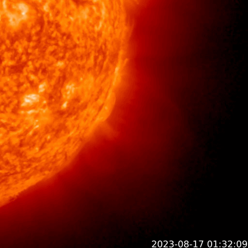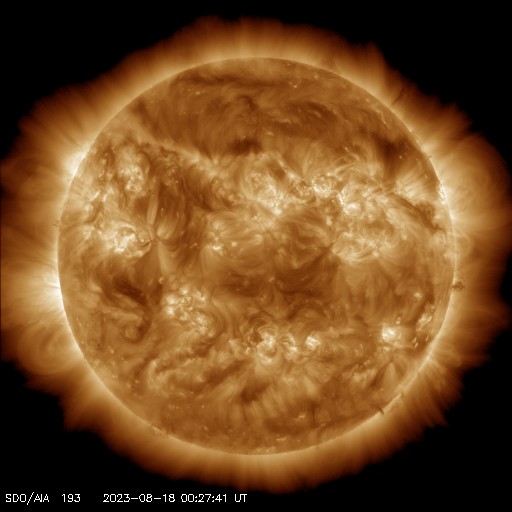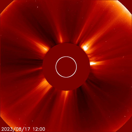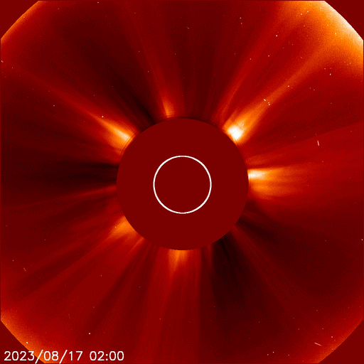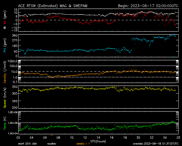 2023/ 8/18 10:38 更新 太陽風は低速の状態が続いています。磁気圏は概ね静穏です。 担当 篠原 太陽風は、330km/秒前後と低速の状態で安定しています。 磁場強度は、7nTの状態から、 グラフの後半で10nTに少し強まる変化が発生しています。 27日周期の図を見ると、 太陽風磁場の大まかな方向を示すセクターのグラフが、 「A」から「T」へ切り替わっています。 この変化と関係する強まりかもしれません。 磁場の南北成分は比較的北寄りのようですが、 時々、南向きの変化も発生しています。 速度が下がっているので影響は限定的ですが、 AE指数は、250nT程度の小規模の変化が時々発生しています。 SDO衛星AIA193では、コロナホールは特に見えていません。 太陽風は穏やかな状態が続きそうです。 太陽では、西の端(右端)の南北で噴出が発生しています。 1つめは、17日11時(世界時17日2時)頃、 南西の端(右下)からプロミネンスが噴出しています。 これによりCME(コロナ質量放出)も発生していて、 SOHO衛星LASCO C2、C3を見ると、 太陽の右下に向かってコロナのガスが広がっています。 2つめは、17日21時(世界時17日12時)頃、 北西の端(右上)で、薄暗く見えていたダークフィラメントが 飛び出しています。 CMEも太陽の右に向かって噴出しています。 どちらも地球に対して横方向の噴出なので、 影響はありません。 また、昨夜から、南東の端(左下)の少し向こう側で、 C1〜3の小規模フレアが度々発生するようになっています。 この後、活動的な領域が現れそうです。 注目して下さい。 ![]() 南西の端で発生したプロミネンス噴出。 (c) GOES衛星SUVI 304 (NOAA)、(動画加工 : 宇宙天気ニュース) ![]() 太陽の右下へ広がるCME。 (c) SOHO衛星LASCO C2、C3 (ESA & NASA)、(動画加工 : 宇宙天気ニュース) ![]() 北西の端で発生したフィラメント噴出。 (c) GOES衛星SUVI 304 (NOAA)、(動画加工 : 宇宙天気ニュース) ![]() 太陽の右へ広がるCME。 (c) SOHO衛星LASCO C2、C3 (ESA & NASA)、(動画加工 : 宇宙天気ニュース) ![]() SDO衛星のAIA193カメラによる太陽コロナの様子 (c) SDO (NASA) ![]() SDO衛星による太陽の可視光写真。マウスの矢印を写真に重ねると、黒点番号付きの写真に切り替わります。 (c) SDO (NASA) ![]() ACEが観測した太陽風の磁場(1番上の枠、白線は全体の強度、赤線は南北成分) および、太陽風の密度(3番目の橙線)、速度(4番目の黄線) (c) NOAA/SWPC ![]() AE指数(速報値) 下段のAEグラフの値が高くなると、オーロラ活動が活発化しています。 (c) 京都大学WDC ![]() ![]() 27日の太陽周期に合わせた図 太陽が同じ面を地球に向けていた27日前の変化から、今後を予想することができます。 (c) 作図:宇宙天気ニュース